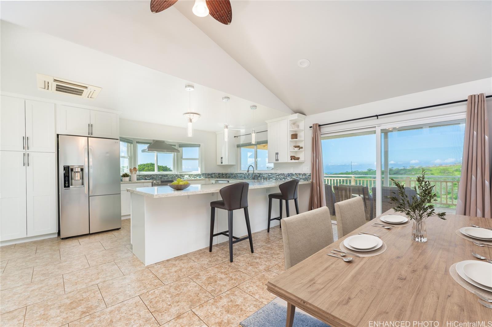 [0] => Beautifully upgraded 3bdrm, 3baths, two-story home on a rare perimeter (rim) lot in Makakilo with no rear neighbors. Enjoy panoramic west-facing views of sunsets, the ocean, coastline, and mountains. The main level features a spacious open living area that flows to a large lanai—perfect for indoor-outdoor living and entertaining in Makakilo’s cool breezes. Recent upgrades include a brand-new kitchen with new cabinetry and all-new appliances, fresh interior paint, modern finishes, and a spacious primary bedroom with a large closet. Additional features include porcelain tile flooring, split and ceiling-mounted A/C systems, and 20 leased solar PV panels with the lease paid in full. The system is on HECO Net Energy Metering (NEM), resulting in very low monthly electric costs. Enjoy multiple outdoor spaces, including a large covered main-level lanai, a lower-level patio, and a private backyard, all ideal for gatherings. This rim lot property offers the perfect blend of comfort, privacy, and breathtaking views, conveniently located minutes from Ka Makana Ali'i Mall, H-1 freeway access, restaurants, schools, bus stops and much more! (Some photos have been virtually staged/enhanced)