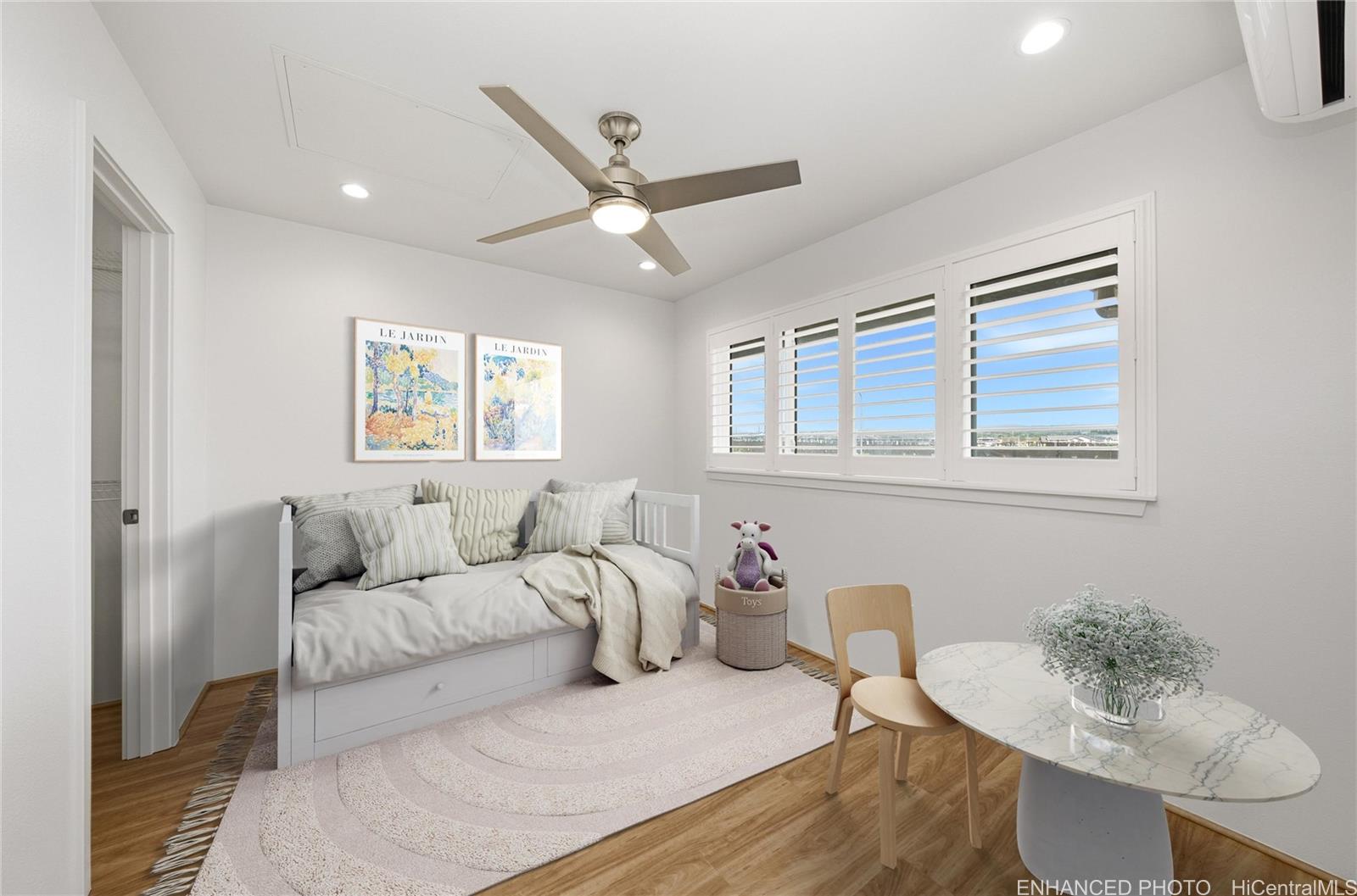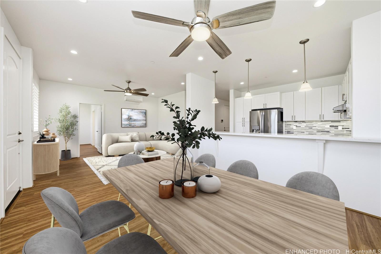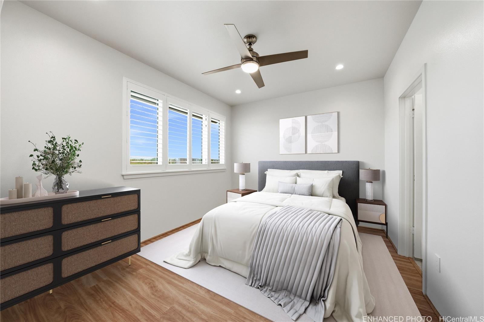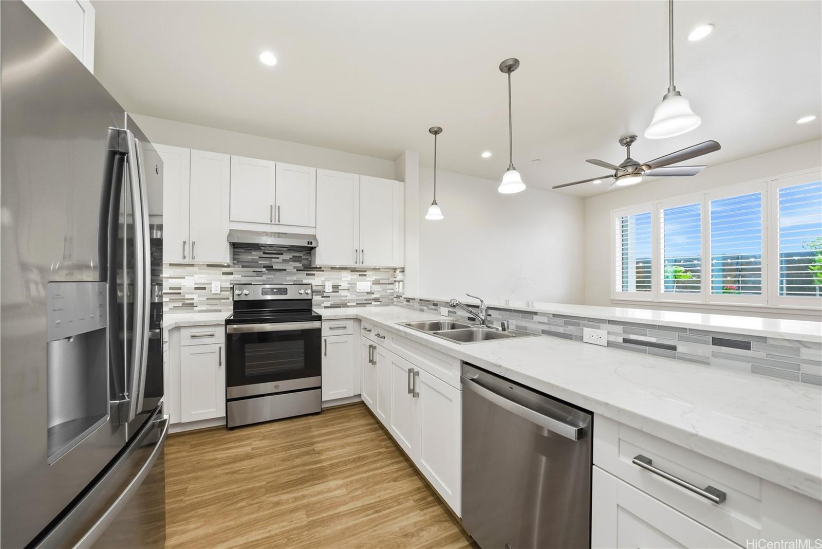 What if you could enjoy the space of a single-family home at a condo price in one of O‘ahu’s newest and most vibrant communities? Built in 2022, this largest model offers a full upgrade package with quartz kitchen countertops, luxury vinyl plank flooring, plantation shutters, recessed lighting with dimmers, split A/C, and ceiling fans in every room. The spacious floor plan provides four bedrooms, a dedicated office, and four parking spaces, including a two-car garage, two additional stalls, EV potential, and guest parking. A ground-level bedroom suite is ideal for your forever home, while a first-floor half bath adds convenience for guests. A smart home system lets you manage lighting, the garage, and security from your phone, paired with double-insulated walls for added quiet and comfort. HOA maintained landscaping and included cable, internet, water, and sewer, creating built-in savings. In the lively Koa Ridge community, you are moments from shared paths, a recreation center with classes and a pool, plus parks and pet-friendly areas that bring neighbors together, with Costco and freeway access close by. One or more photos are enhanced. Listing by: Keller Williams Honolulu (808) 551-1535