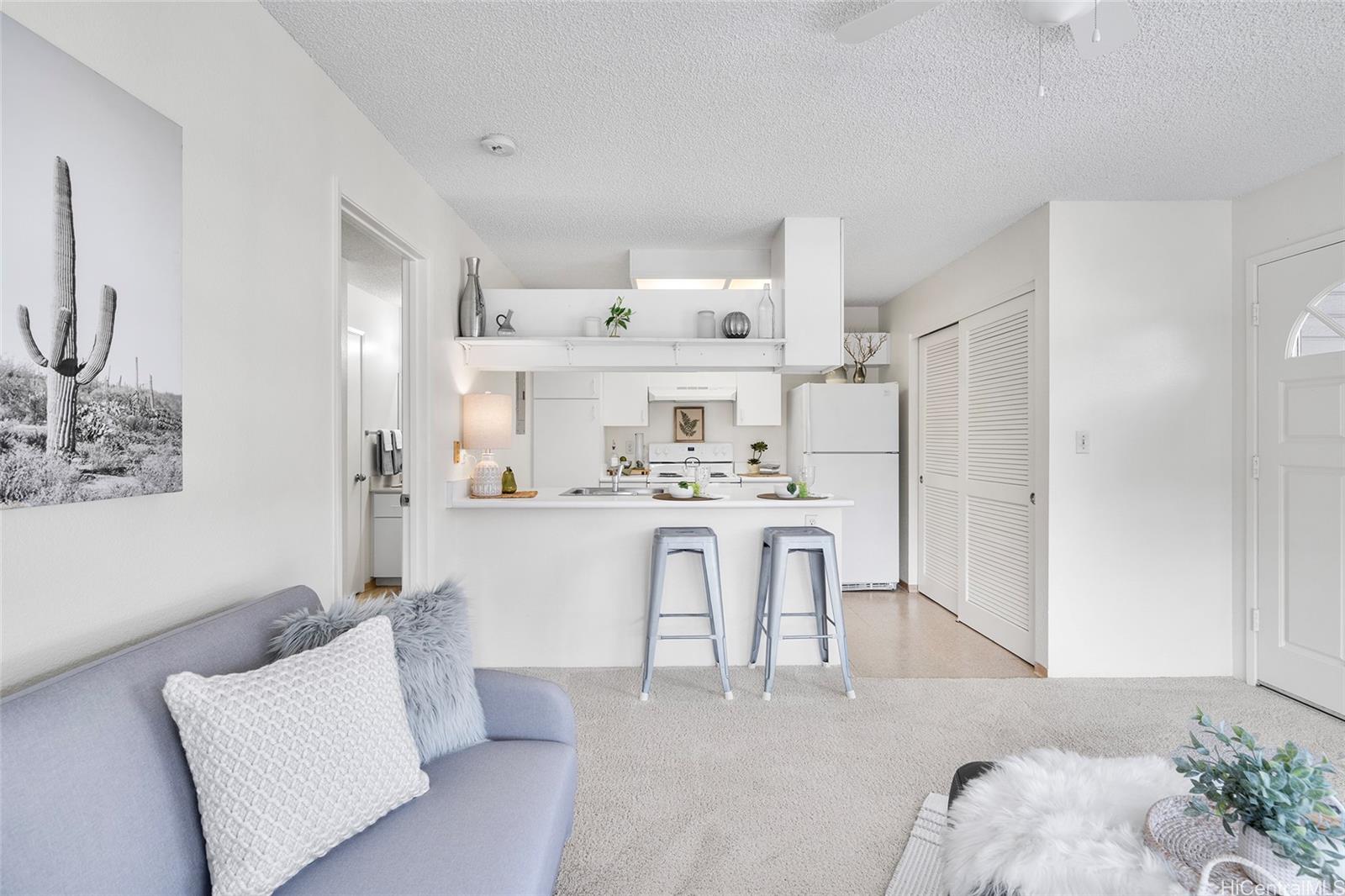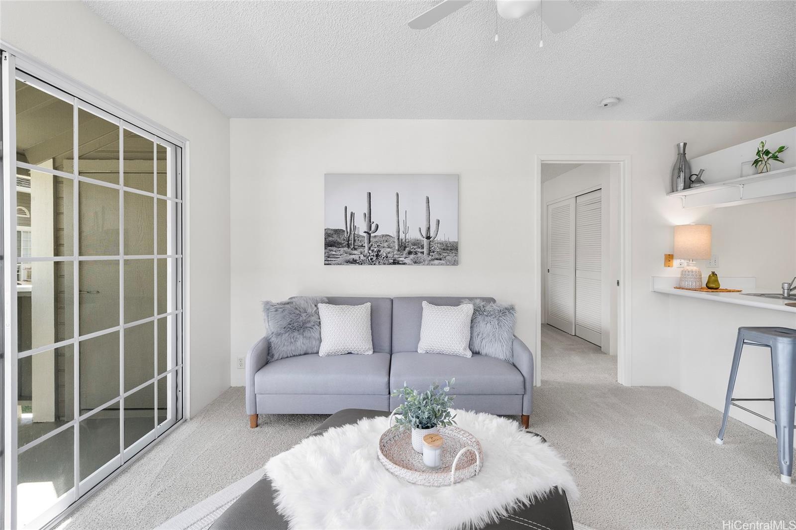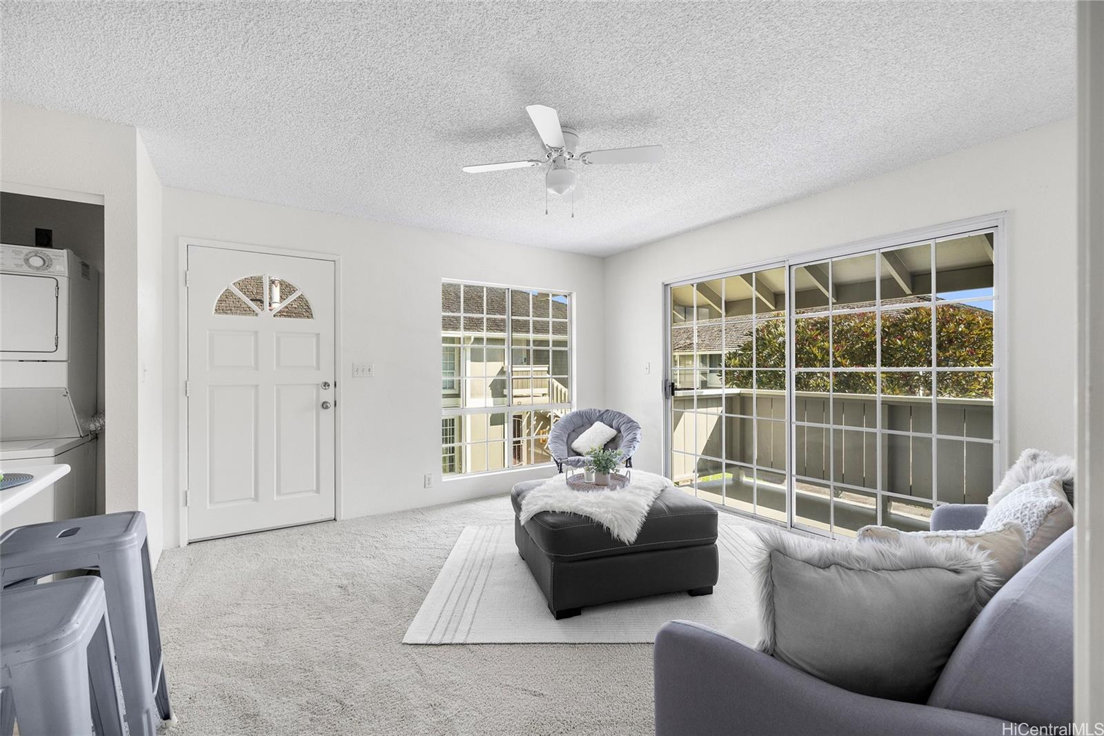Take advantage of this opportunity to own this 2nd floor 1 bed, 1 bath unit in the desirable Royal Palm at Waipio! This unique townhouse unit has brand new carpeting throughout and includes a lanai with storage closet, stacked washer/dryer and 1 covered parking! This complex is centrally located near shops, parks and restaurants! Listing by: Engel & Volkers Honolulu (808) 479-9090
