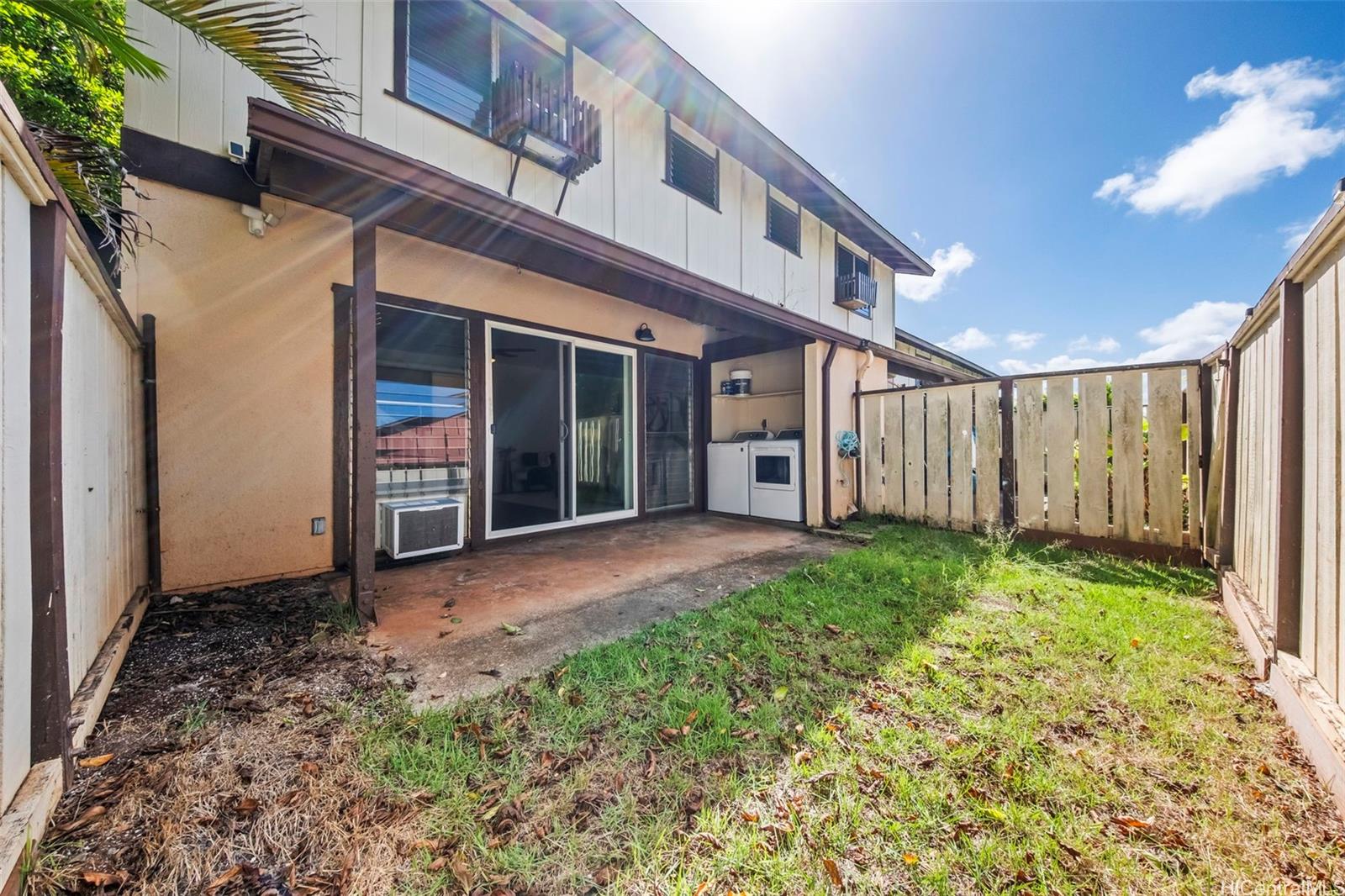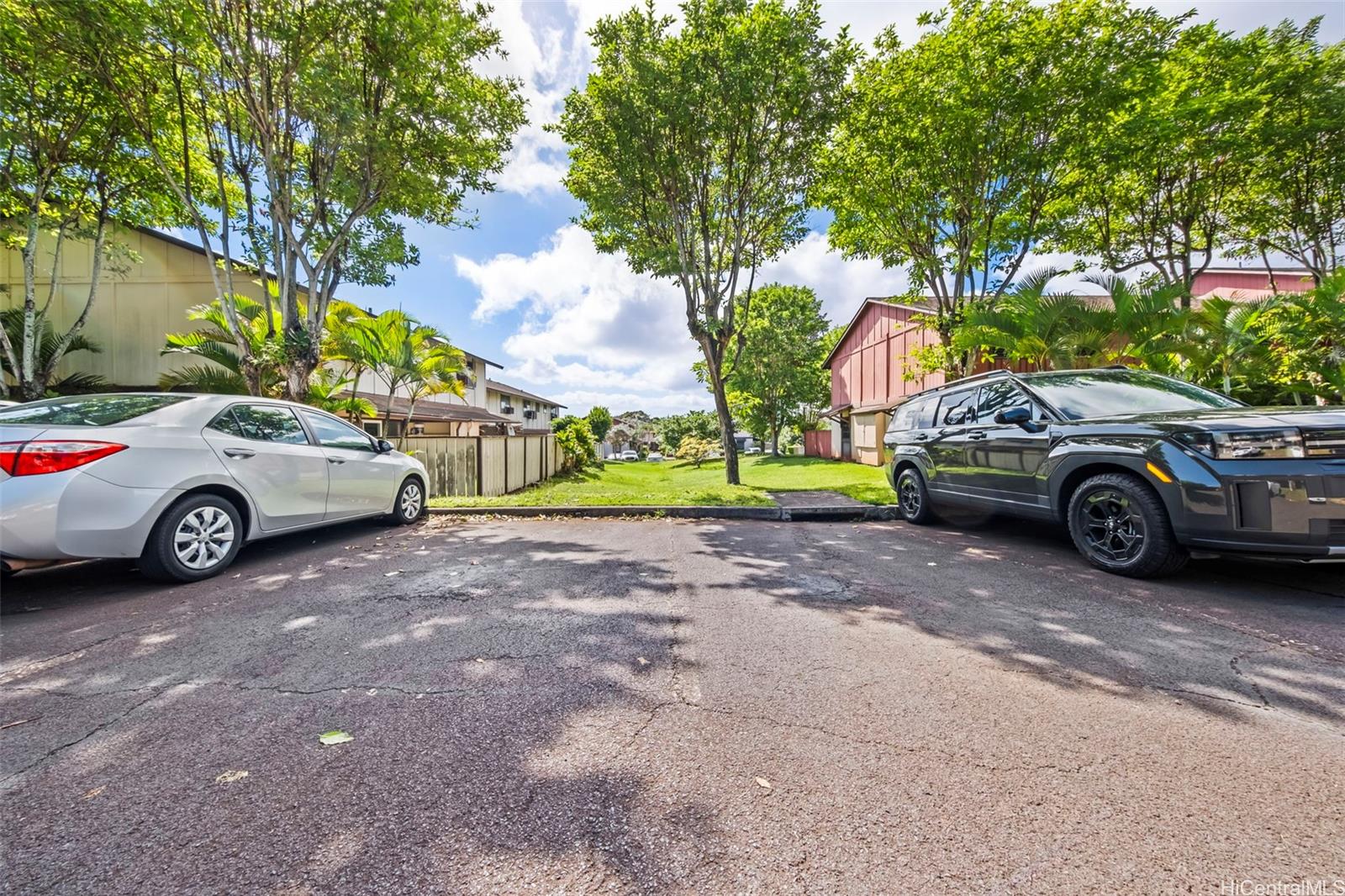 A cozy, clean, and contemporary oasis awaits you in Nob Hill! Tucked between vibrant greenery, the front door to this 3 bed, 2.5 bath unit opens to a beautifully welcoming dining area, just across from the kitchen. Lovely white cabinetry with black finishings are offset by lush garden views through the surrounding windows, making this a perfect place for any home chef to enjoy cooking and baking to their heart's content. Step through to the living room where sliding doors let in tons of natural light, and imagine the many ways you will be able to utilize the covered lanai just outside (outdoor gym, lounging area, or BBQ space -- you name it!). Walk up stairs to the sleeping quarters, complete with ample closet space and bathrooms with soaking tubs to ensure the utmost in rest and relaxation every night. Two parking stalls make multi-car family living a breeze, and Air Conditioning throughout guarantees comfortability even on hot summer days. Located just a few minutes drive from Mililani Town Center, MTA Rec Centers, Mililani High School, and Mililani Shopping Center - this is a unit not to be missed. Schedule a showing today! Listing by: Vesta Hawaii Real Estate (808) 561-8200