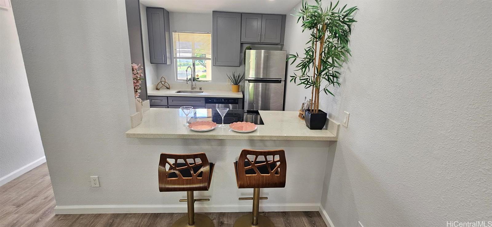 [0] => Beautiful corner unit featuring stunning views of Diamond Head! This recently renovated home offers modern upgrades throughout, including vinyl flooring, gray shaker cabinets, quartz countertops, and stainless steel appliances. The thoughtfully updated bathroom showcases a sleek floor-to-ceiling tiled shower, and the home is complete with a front-load washer and dryer, fresh paint, and newer carpet.