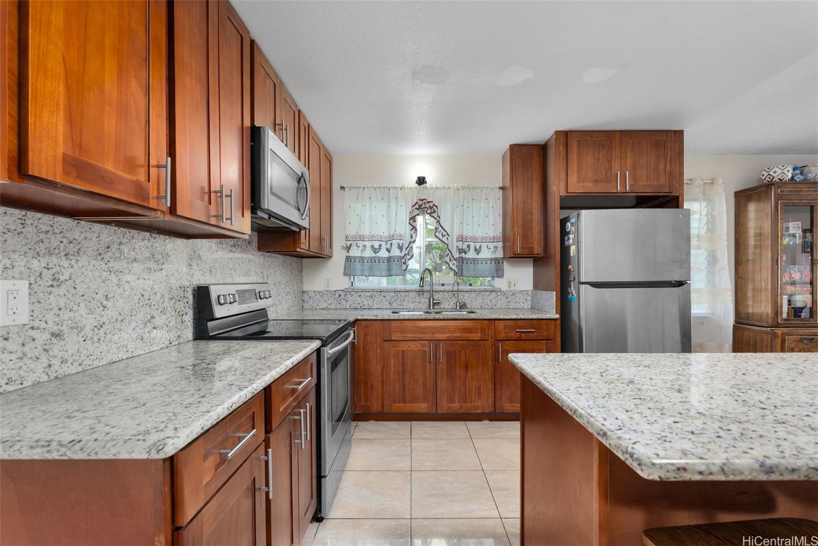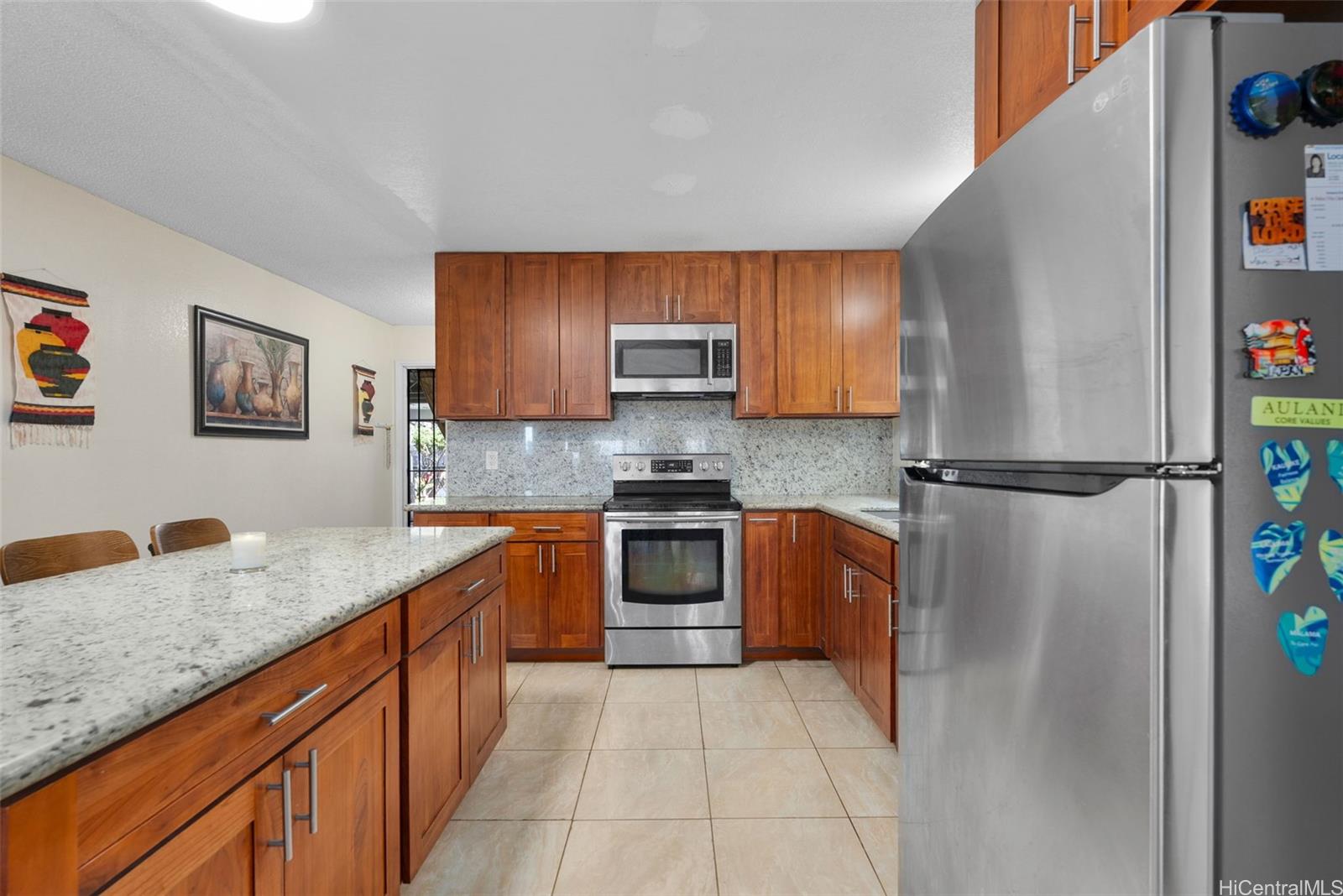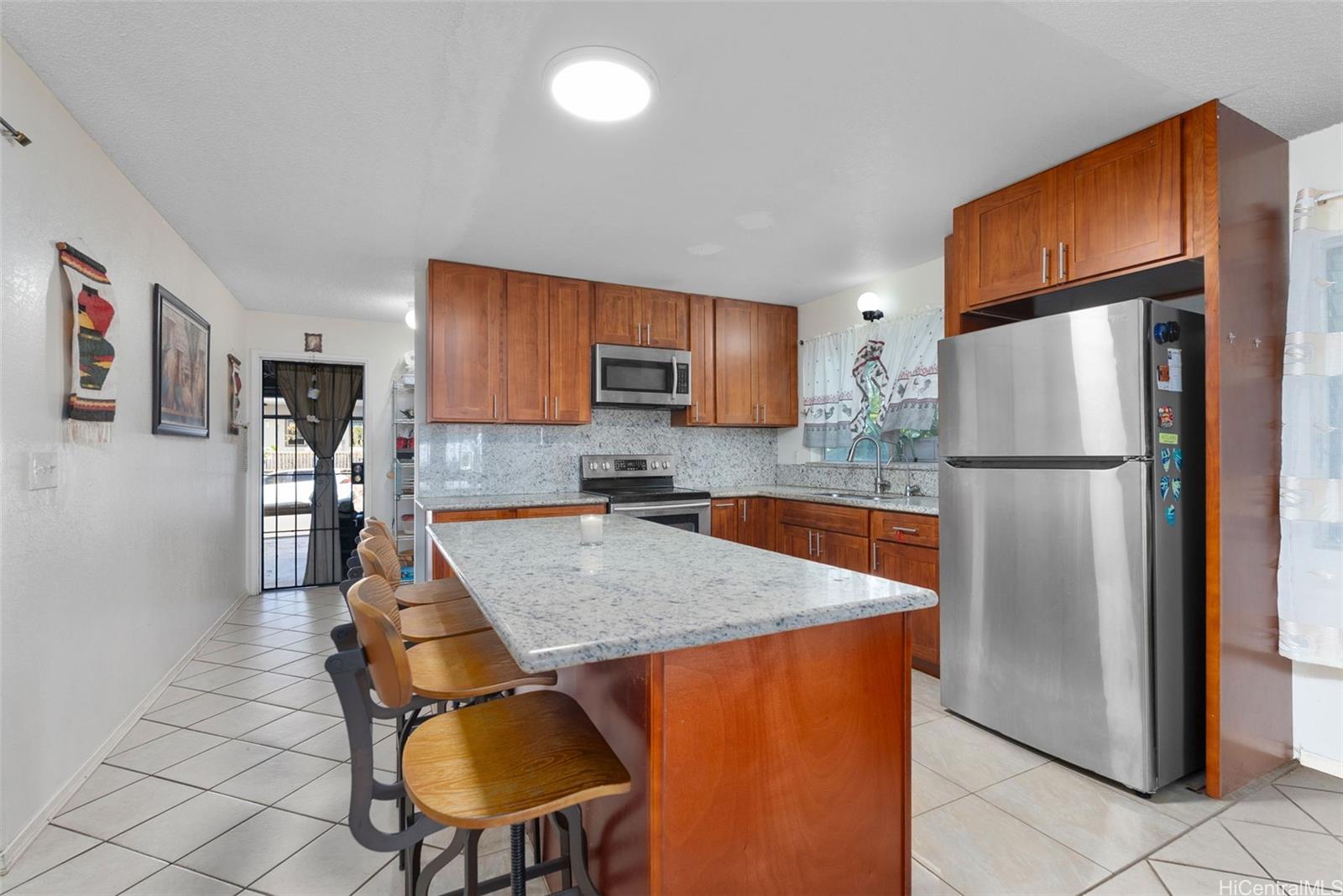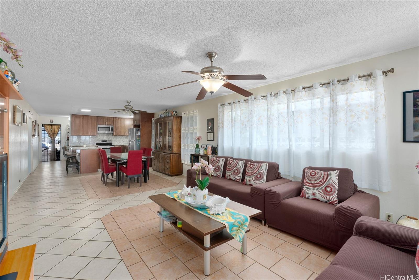Come view this 3-bedroom, 2 full bath with a 2-car garage and driveway for additional parking home in Village Park. The flooring is equipped with ceramic tile throughout. The kitchen has been updated with a spacious countertop and island which opens to the living room perfect for hosting and gatherings. A spacious primary bedroom that will serve as your own sanctuary and two standard sized bedrooms. There are 20 owned photovoltaic panels as an added bonus lowering your electricity consumption and new roof in 2015. This home is in close proximity to school, public park, freeway access, Queens Medical Center, Ka Makana Alii, Walmart, Times and more."