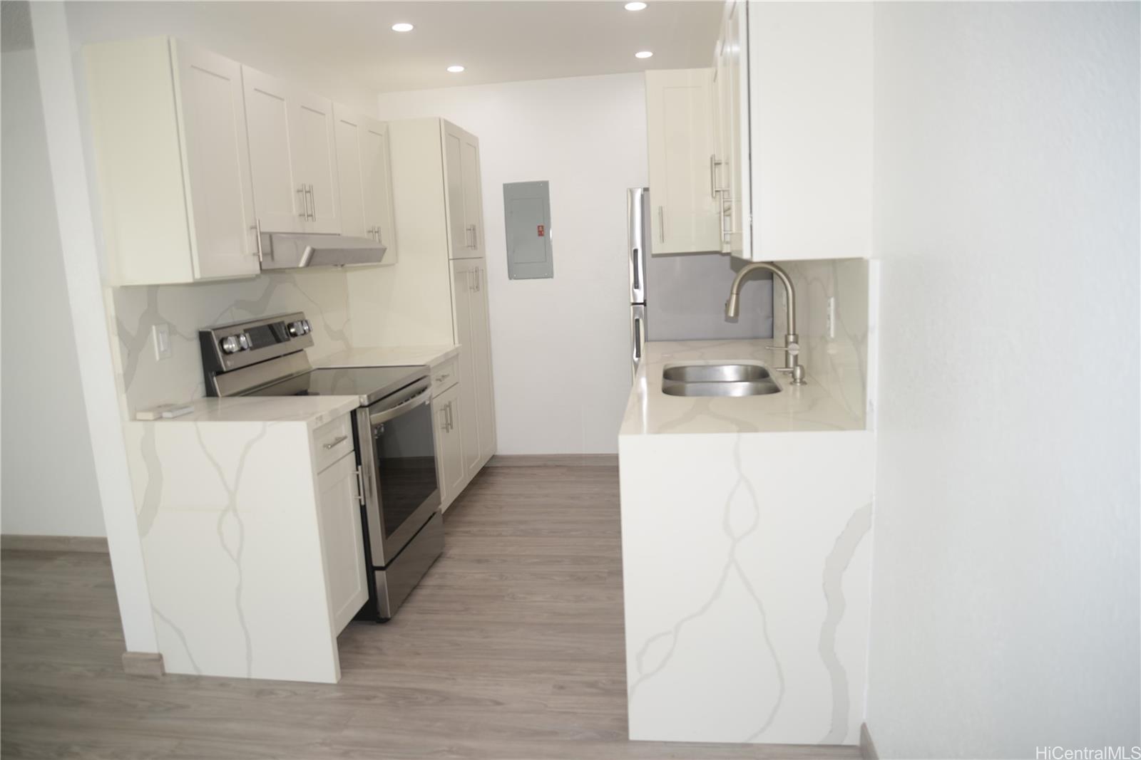 No Upstairs unit, rarely listing single level apartment upgraded in 2024 with new windows, new split air conditioning, new cabinets and counter tops, new electrical fixtures, and much more. Even the bathroom was totally redone in 2024. Flooring was installed in 2023. Apartment is positioned to catch the trade winds. The enclosed patio has a large concrete slab added to the small, covered lanai. Listing by: Horita Realty LLC (808) 258-5242