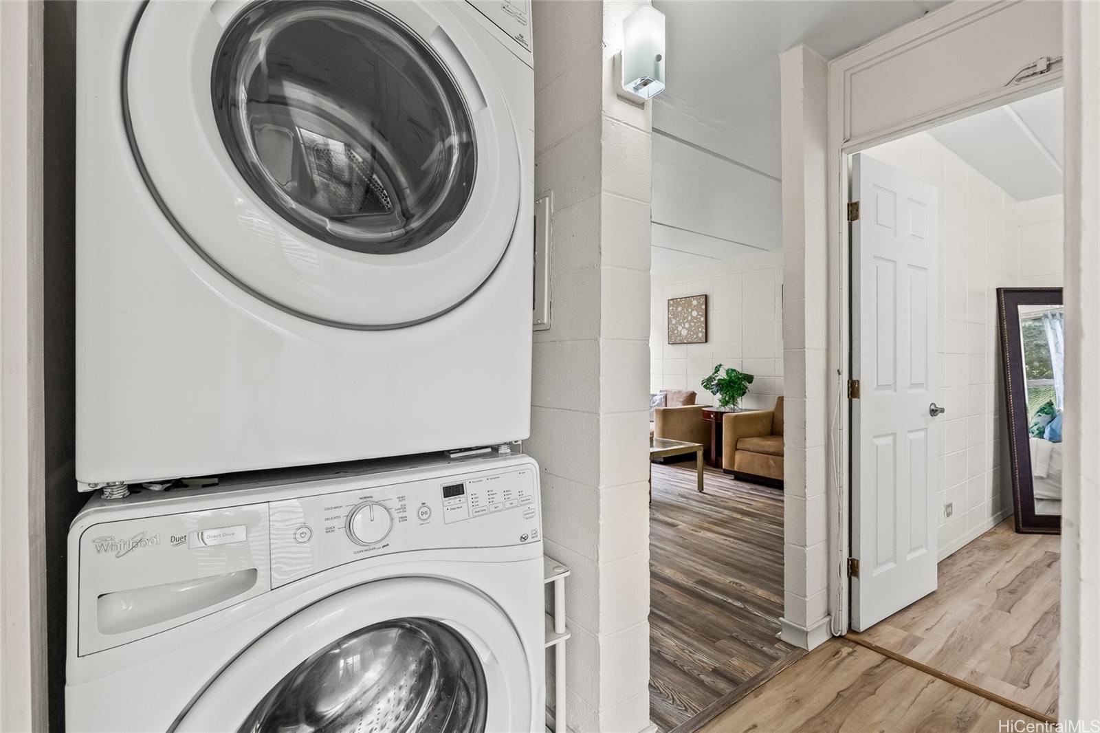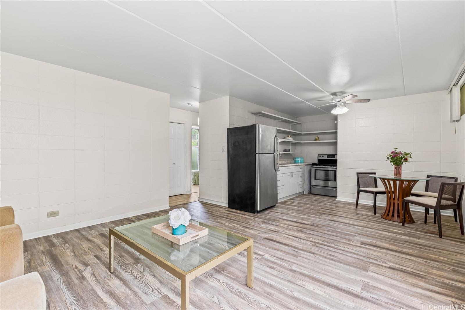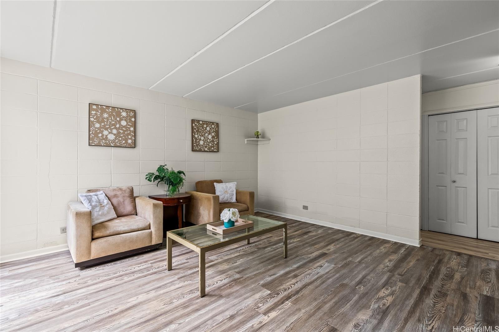 This spacious ground floor unit at Waipio Gardens features an open floor plan, an upgraded kitchen, and a renovated bathroom with a new shower and vanity. This condo also includes vinyl flooring and a front-load washer and dryer.