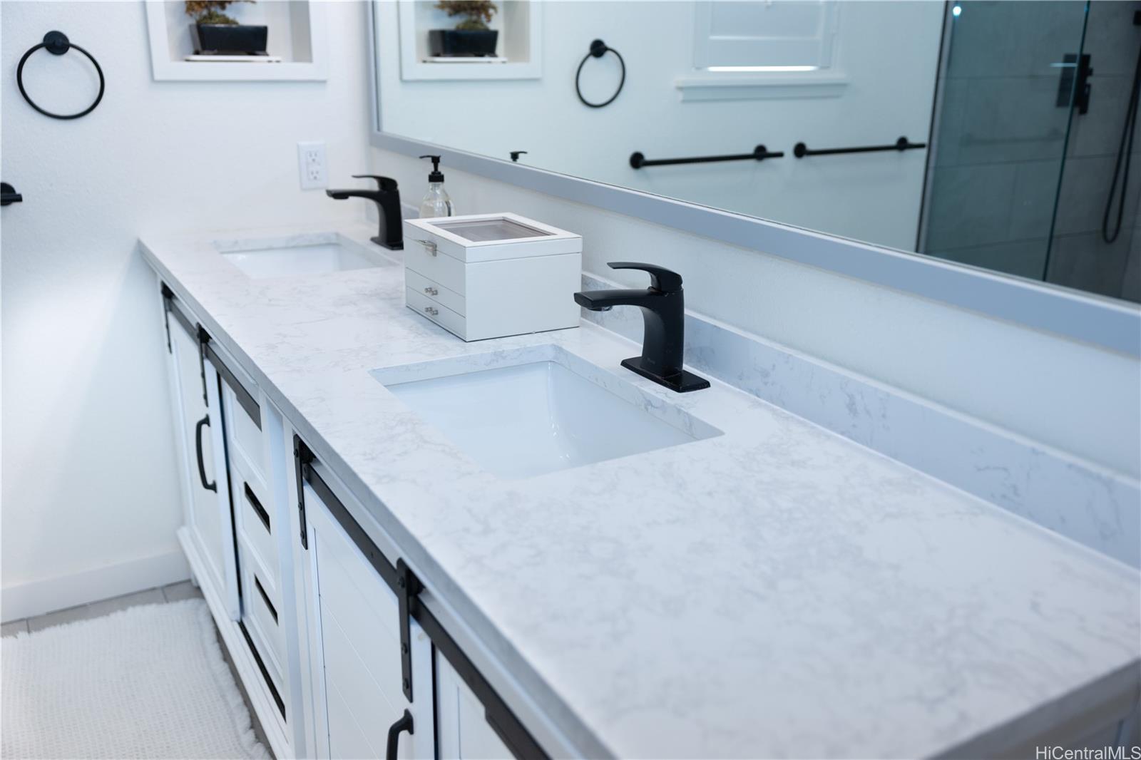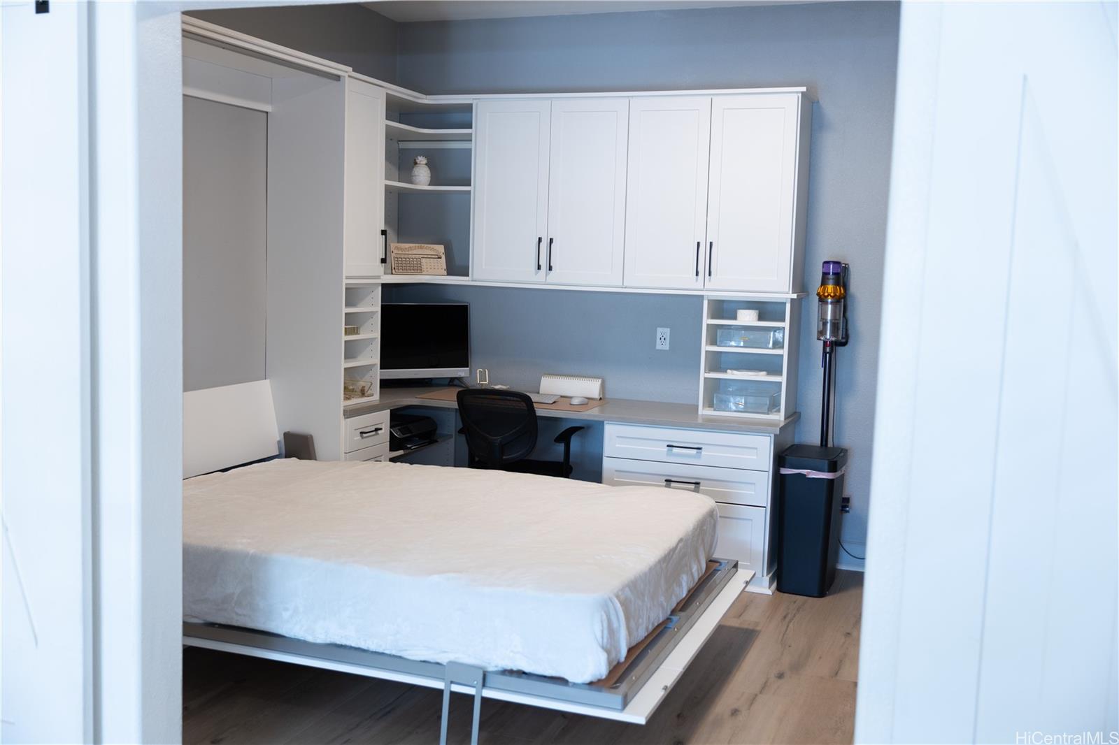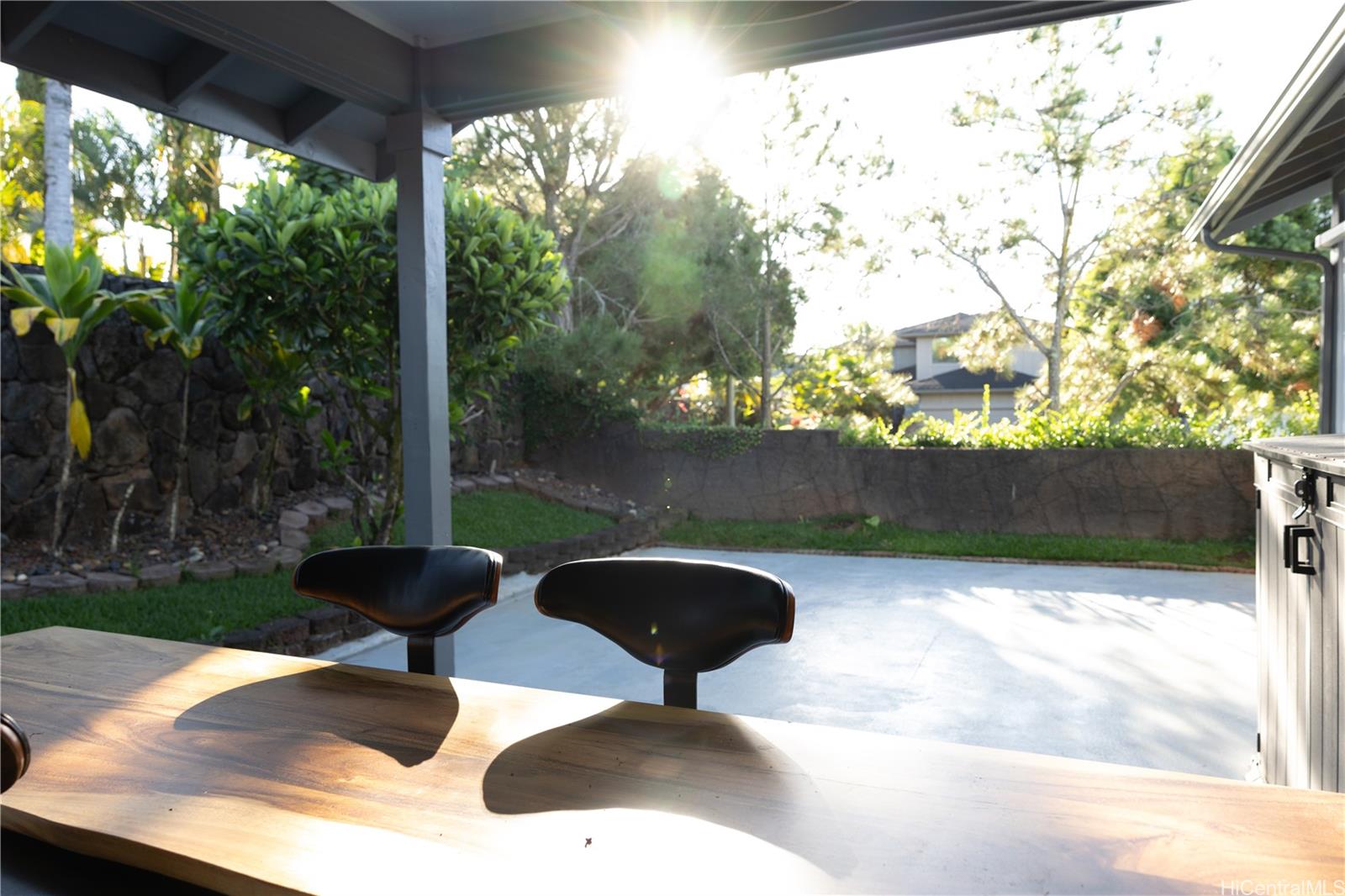 [0] => Just a short walk to Mililani Elementary and Middle Schools and Rec Ctr 7. This single story home has a versatile den, tastefully renovated with modern comfort, island charm, with true family living in mind. As you step inside, you're greeted by an elegant dining area and a stunning brand new kitchen - complete with a spacious island, corner coffee bar, and beautiful finishes throughout. The kitchen flows seamlessly into a large family room, highlighted by vaulted ceilings. The den is a thoughtfully designed as a multi-purpose room featuring custom cabinetry and a Murphy bed. Perfect as a home office, laundry room, or guest retreat - flexible space truly adapts to your lifestyle. Down the hallway, you'll find two comfortable bedrooms and a full bathroom with double sinks, ideal for family or guests. The primary suite is a true sanctuary. Custom closets, nightstands, and dressers fill the space with luxury and organization. The ensuite bathroom features a large walk-in shower and dual sinks. Step outside to a spacious, partially covered patio, perfect for entertaining friends, hosting family gatherings, or simply enjoying the cool Mililani breezes.