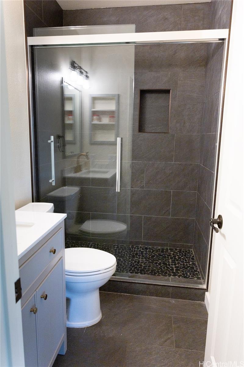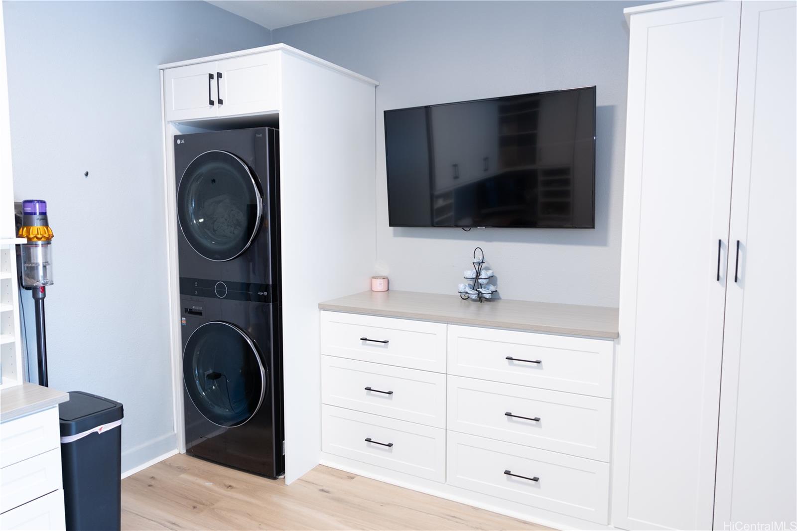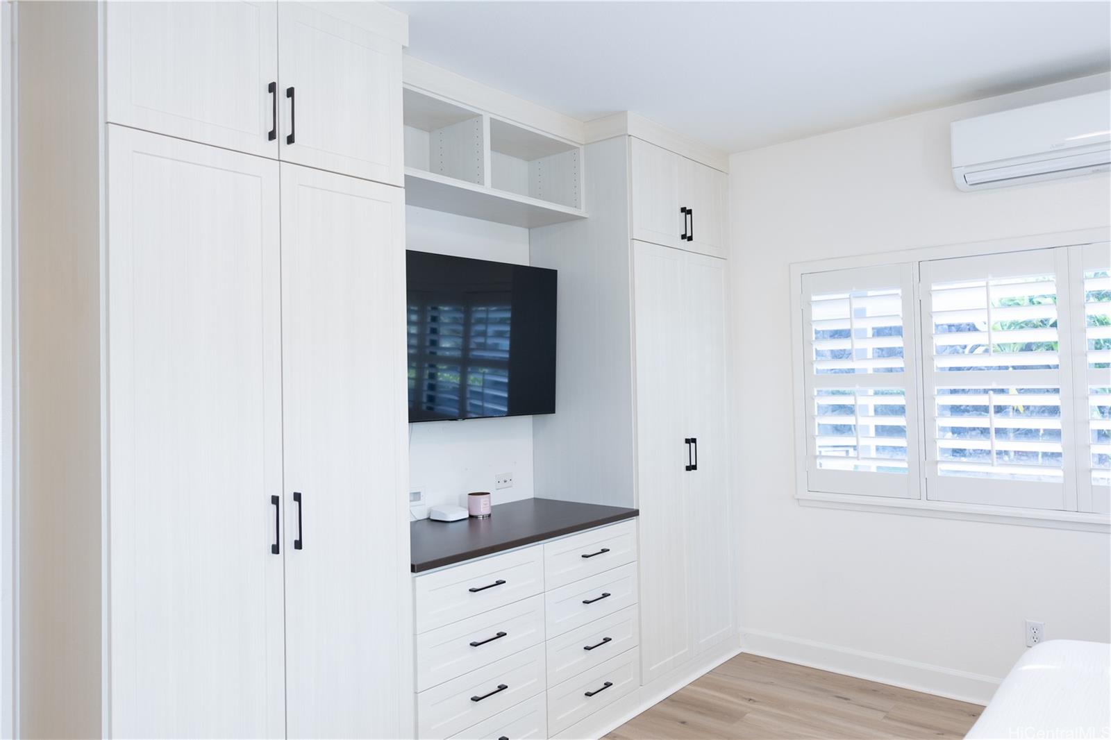 [0] => Just a short walk to Mililani Elementary and Middle Schools and Rec Ctr 7. This single story home has a versatile den, tastefully renovated with modern comfort, island charm, with true family living in mind. As you step inside, you're greeted by an elegant dining area and a stunning brand new kitchen - complete with a spacious island, corner coffee bar, and beautiful finishes throughout. The kitchen flows seamlessly into a large family room, highlighted by vaulted ceilings. The den is a thoughtfully designed as a multi-purpose room featuring custom cabinetry and a Murphy bed. Perfect as a home office, laundry room, or guest retreat - flexible space truly adapts to your lifestyle. Down the hallway, you'll find two comfortable bedrooms and a full bathroom with double sinks, ideal for family or guests. The primary suite is a true sanctuary. Custom closets, nightstands, and dressers fill the space with luxury and organization. The ensuite bathroom features a large walk-in shower and dual sinks. Step outside to a spacious, partially covered patio, perfect for entertaining friends, hosting family gatherings, or simply enjoying the cool Mililani breezes.