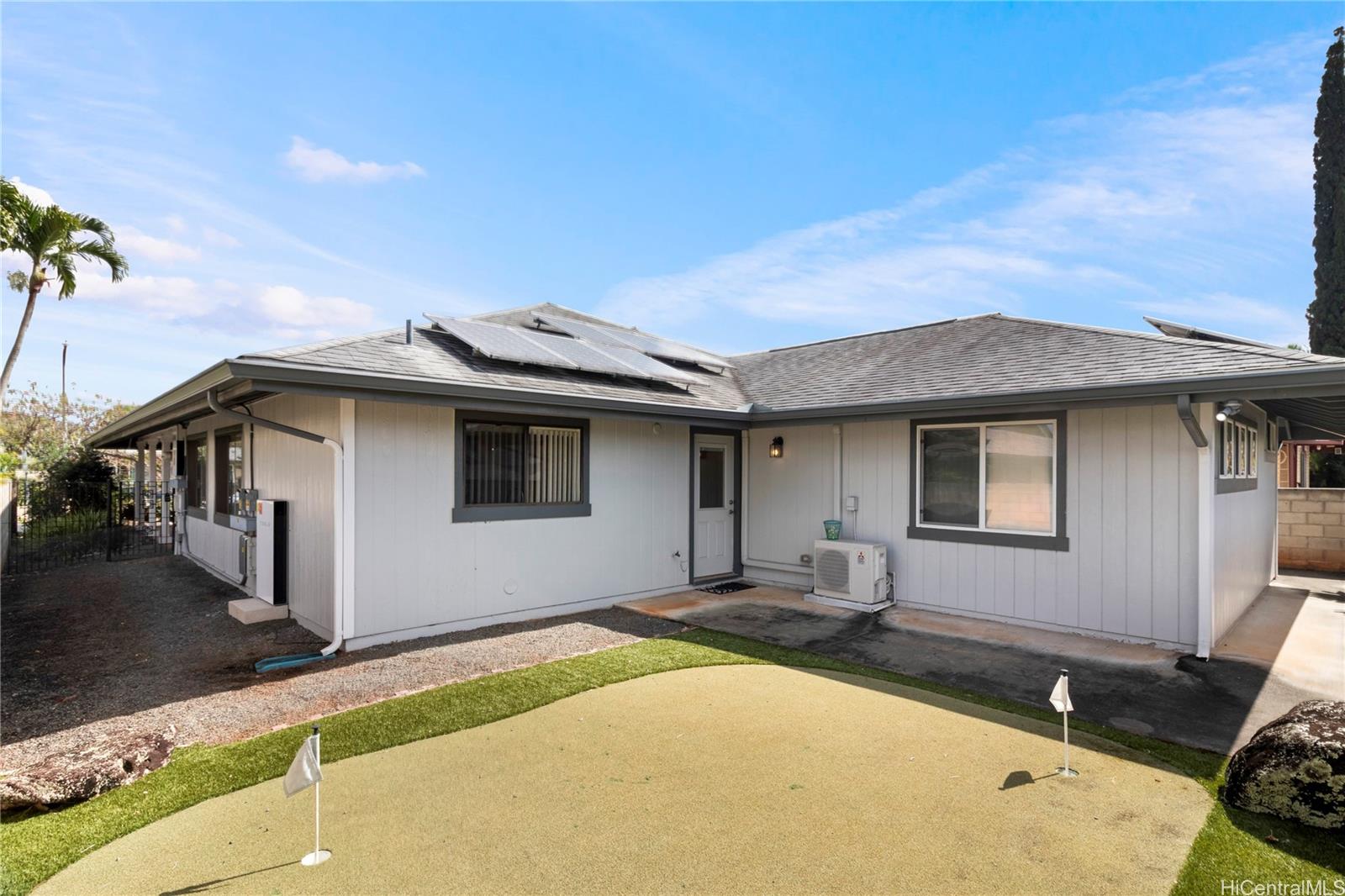 Welcome Home to Mililani Mauka! Step into this rarely available 4-bedroom, 3-full-bath detached single-family home perfectly situated in the desirable Mililani Mauka community. With 2,058 sq. ft. of interior living space, this home boasts soaring vaulted ceilings, an inviting open-concept kitchen, and a spacious primary suite that includes a bonus ensuite with a wet bar and separate entrance - perfect for guests, multi-generational living, or a potential renter. Beautifully renovated and meticulously maintained, this home features a fully gated property, a low-maintenance yard, and your very own private putting green. Enjoy energy efficiency and sustainability with 43 OWNED PV panels, a Tesla battery, and a solar water heater, helping you keep electricity costs low. There are no HOA fees — just the Mililani Town Association membership, which provides access to 7 recreation centers, 5 pools, 12 tennis courts, and over 15 parks! Conveniently located just minutes from the freeway onramp, Costco, multiple shopping centers, and top-rated schools including Mililani High School, Mililani Middle School, and Mauka Elementary. Homes like this don’t come along often! Listing by: Hawaii Modern Realty (808) 561-4785