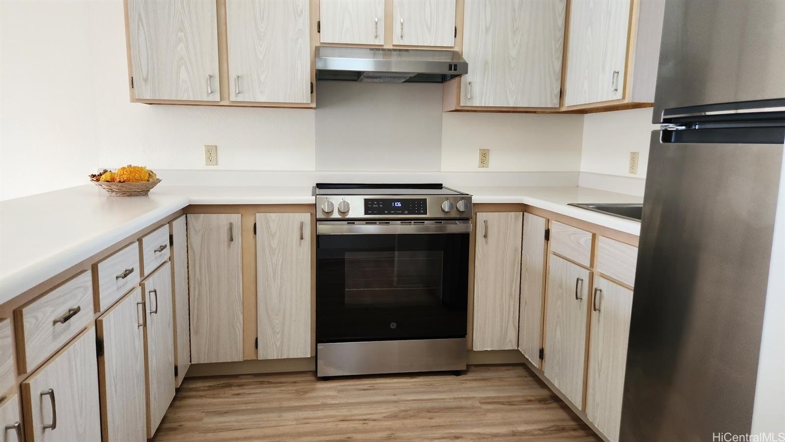 This unit includes new appliances:   range-oven, range-hood, whirlpool refrigerator, garbage disposal, new vinyl flooring, new vanity in the bath, new plumbing fixtures, and toilet.