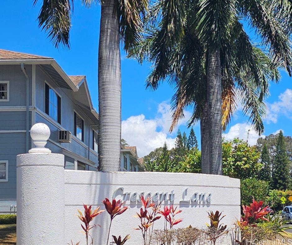Cozy 2-bedroom, 2-bath corner/end ground-floor unit in Crescent Lane 3. Enjoy a private courtyard backing to open green space, giving the home a peaceful, private feel within a small community. Inside, you’ll find a modern kitchen and bath with upgraded cabinets, stainless steel appliances, and laminate/vinyl flooring throughout. Unit includes two side-by-side parking stalls plus extra storage for convenience. Low maintenance fees with access to seven Mililani recreation centers, offering pools, sports courts, and more. Pet-friendly (per house rules). Conveniently located—walk to schools, shopping, dining, and bus lines, with easy freeway access nearby. Listing by: Real Broker (855) 450-0442