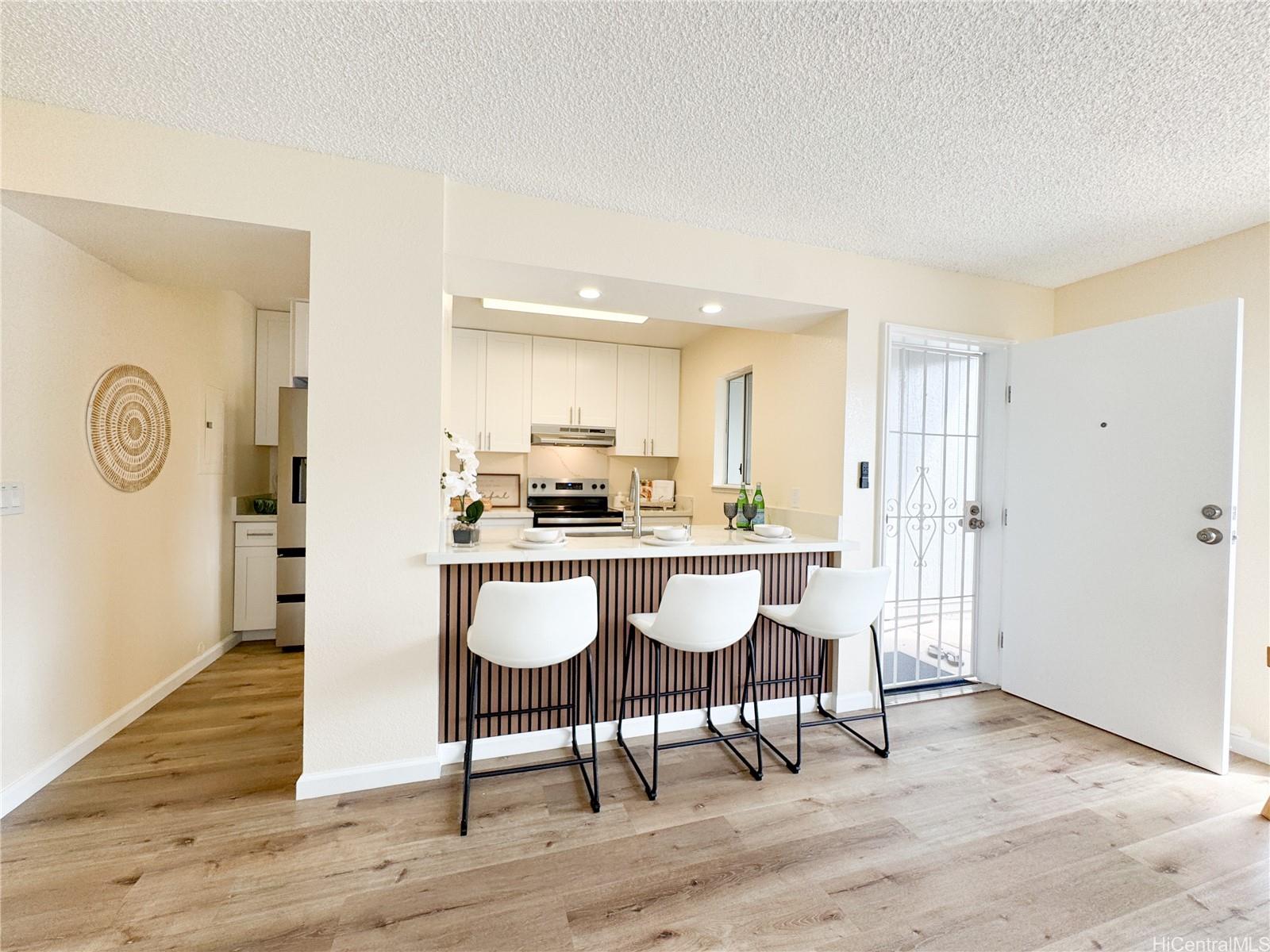 [0] => Welcome to your New Home in the heart of Mililani Mauka! Beautiful, completely remodeled 3bedroom 2bath ground floor end unit townhome. Ideally located on the perimeter of the Hillsdale townhome complex with no neighbor on one side or in the back, only serene green space & extra street parking. Fabulous Upgrades include NEW stainless-steel appliances, dishwasher, stove, refrigerator, large kitchen sink, custom cabinets, & gorgeous quartz countertops. New luxury vinyl plank flooring throughout entire home in neutral tones leaving room for your creative design. All new paint, large stacked washer/dryer in the unit. Two full sized side by side parking stalls right in front. Enjoy the many recreation centers, the newest Rec 7 boasting a heated saline pool, kiddie pool, internet cafe, volleyball, free Wi-Fi, indoor volleyball, basketball courts, BBQ pavilion and playground. Conveniently located near top-rated schools, shopping, dining, this home is ideal for those seeking both comfort and convenience. Quick access to H-2 freeway and Kam Hwy, shopping centers, restaurants, schools and Park and Ride. Don’t miss this wonderful opportunity—contact us today for a private showing!