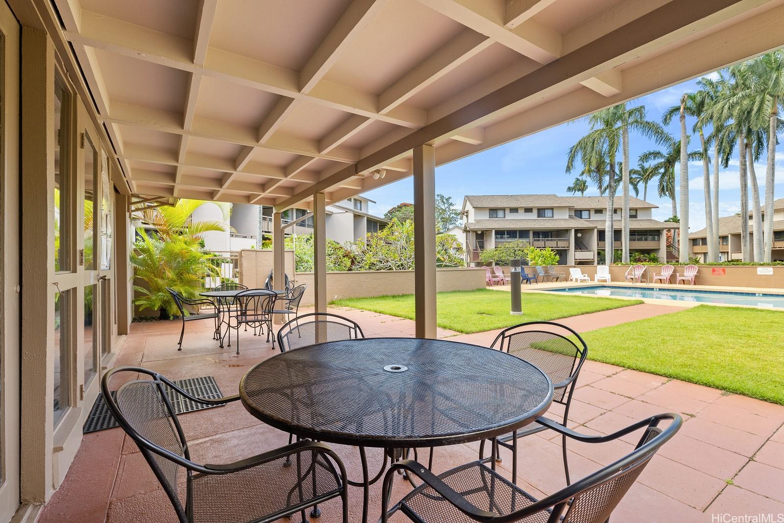 The open, airy layout features a separate dining area and an expansive living room that flows effortlessly to a huge screened lanai, perfect for entertaining and indoor-outdoor living.  Step outside to a fenced garden area and lush greenery views.  Both bedrooms are generously sized, with the primary suite offering a walk-in closet.  This end-unit gem includes two covered, side-by-side parking stalls and a large private storage room.  Residents enjoy access to a beautiful swimming pool and a recreation room for gatherings or meetings, all within a highly sought-after tropical community adjacent to Mililani Golf Club and its restaurant.  You'll also have membership in the Mililani Town Association that provides access to seven recreation centers and a host of amenities."