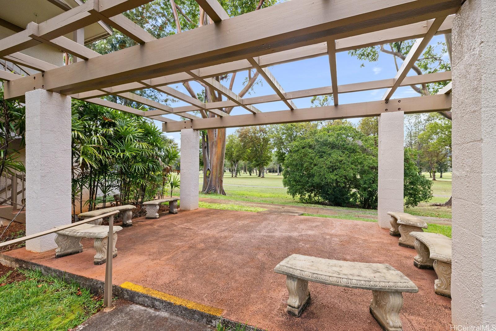 Outstanding!!! This spacious and freshly updated single-level, first-floor townhome boasts 2 bedrooms and 2 baths with recent upgrades to include fresh paint, all-new flooring, a brand-new range and microwave, sleek quartz countertops with a new sink, reglazed tubs and surrounds, and a new water heater—ready for you to move in without a worry. The open, airy layout features a separate dining area and an expansive living room that flows effortlessly to a huge screened lanai, perfect for entertaining and indoor-outdoor living. Step outside to a fenced garden area and lush greenery views. Both bedrooms are generously sized, with the primary suite offering a walk-in closet. This end-unit gem includes two covered, side-by-side parking stalls and a large private storage room. Residents enjoy access to a beautiful swimming pool and a recreation room for gatherings or meetings, all within a highly sought-after tropical community adjacent to Mililani Golf Club and its restaurant. You'll also have membership in the Mililani Town Association that provides access to seven recreation centers and a host of amenities. Listing by: Island View Homes, LLC (808) 255-2583