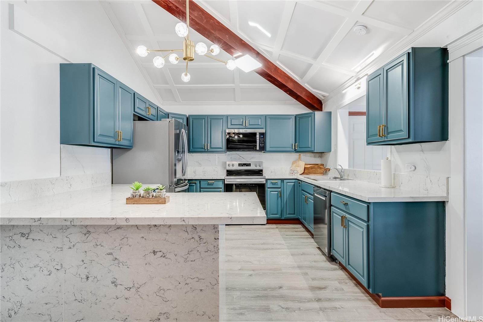 Inside, soaring coffered ceilings, plantation shutters, and beautifully exposed wood beams create an inviting, charming atmosphere. The kitchen features designer cabinetry, brand-new stainless steel appliances, and custom finishes perfect for entertaining or everyday living. Bathrooms feature custom tilework, and 24 owned PV panels provide year-round energy efficiency. Relax or host in the expansive covered lanai, enjoy the front and back yards with fruit trees, and take advantage of the spacious 2 vehicle garage plus ample storage space!