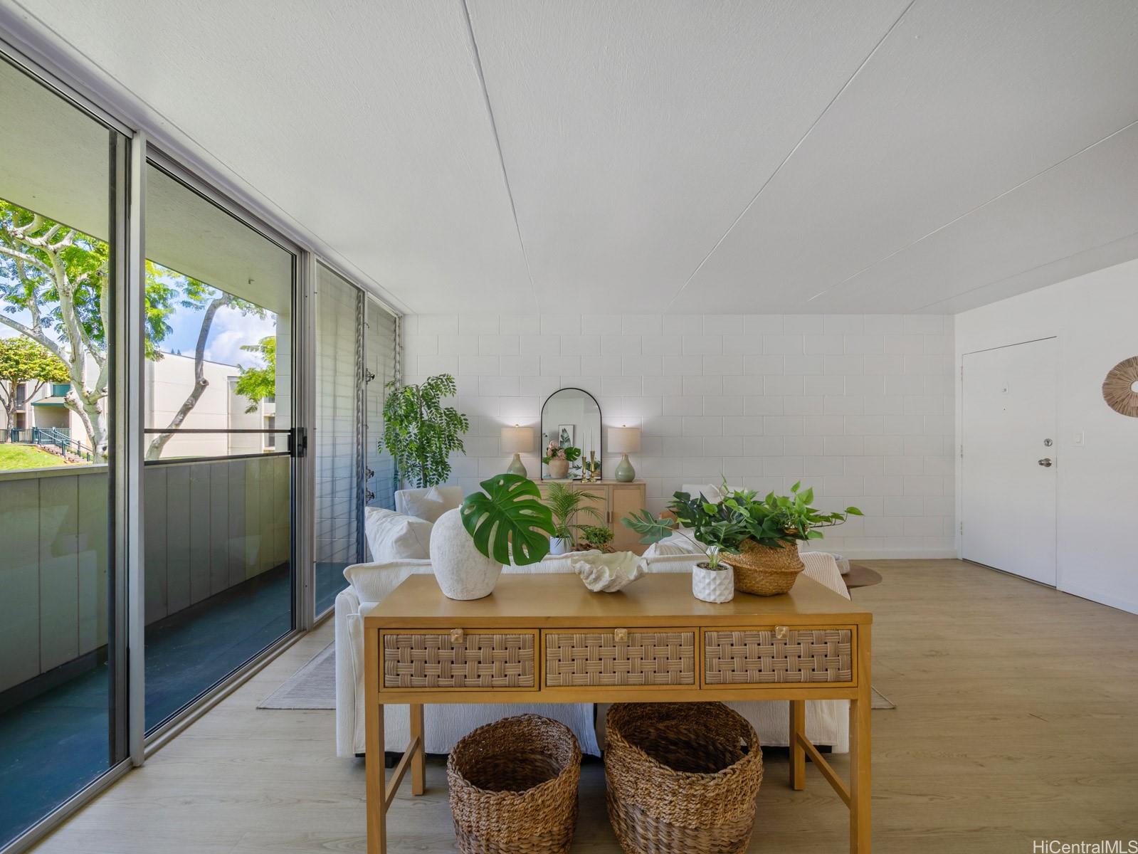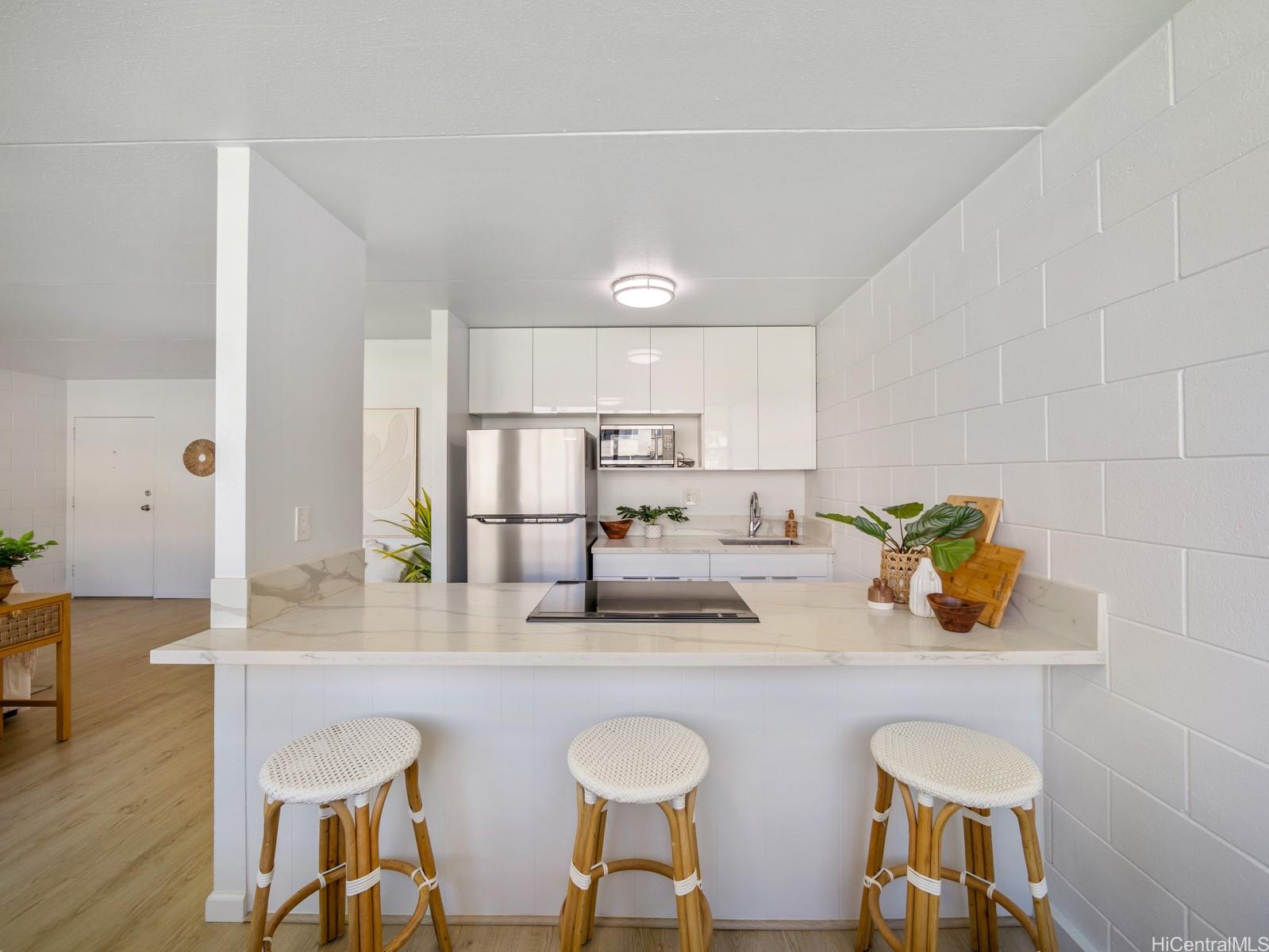 [0] => Fully renovated in 2022, this beautifully updated 2-bedroom, 1-bath Nahoa Apartments home in Mililani is truly move-in ready! The modern kitchen features quartz countertops, sleek white cabinetry, and upgraded appliances. Vinyl plank flooring flows throughout the open living space, complemented by fresh paint, new fixtures, and a recently replaced water heater. Located on the second floor, this corner-unit condo offers privacy, great natural light, and a breezy layout. Community laundry is available in the building next door. Enjoy convenient access to shopping, dining, parks, schools, and nearby military bases. Nahoa Apartments is a pet-friendly community with guest parking, lush open green spaces, and a resident manager--all within the award-winning Mililani Town Association with access to seven recreation centers, pools, and family-friendly amenities.