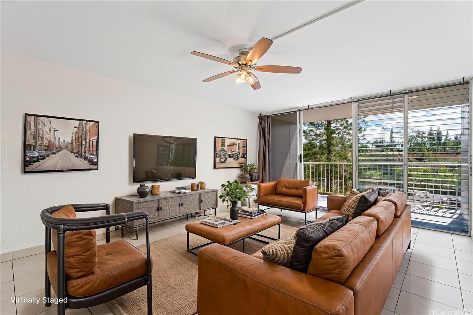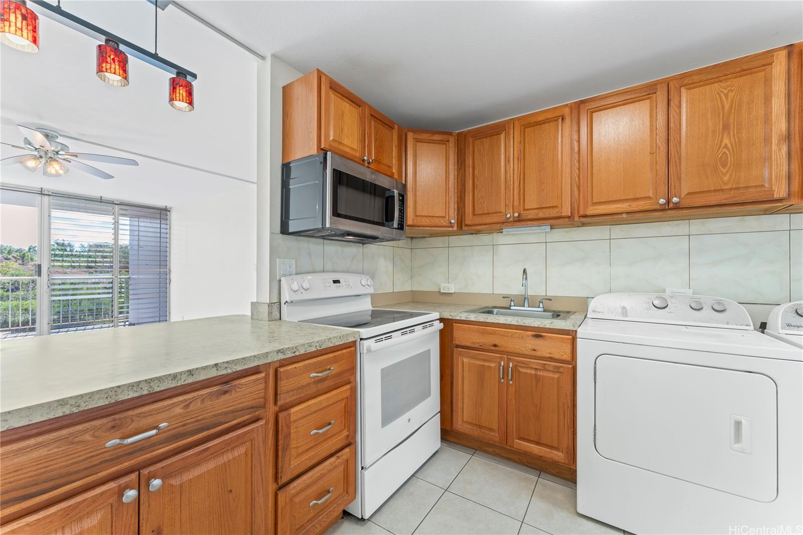 Listed more than $35,000 below assessed value, and it comes with 2 parking stalls! It’s move-in ready and priced to sell. Perfect for first time homebuyers, buyers looking to downsize, or makes a great rental as an investment property. Upgrades include ceramic tile throughout, an updated kitchen with wood cabinets, newer appliances, a full-size washer and dryer, and fresh paint (interior and exterior). The bathroom en-suite has been updated and is outfitted with a newer vanity, a full tub with new tile, and an attached walk-in closet. This sixth-floor corner unit is in a great spot to catch the tradewinds. This property hosts a large, covered lanai, just shy of 100sf, that overlooks a nicely landscaped grassy garden area.