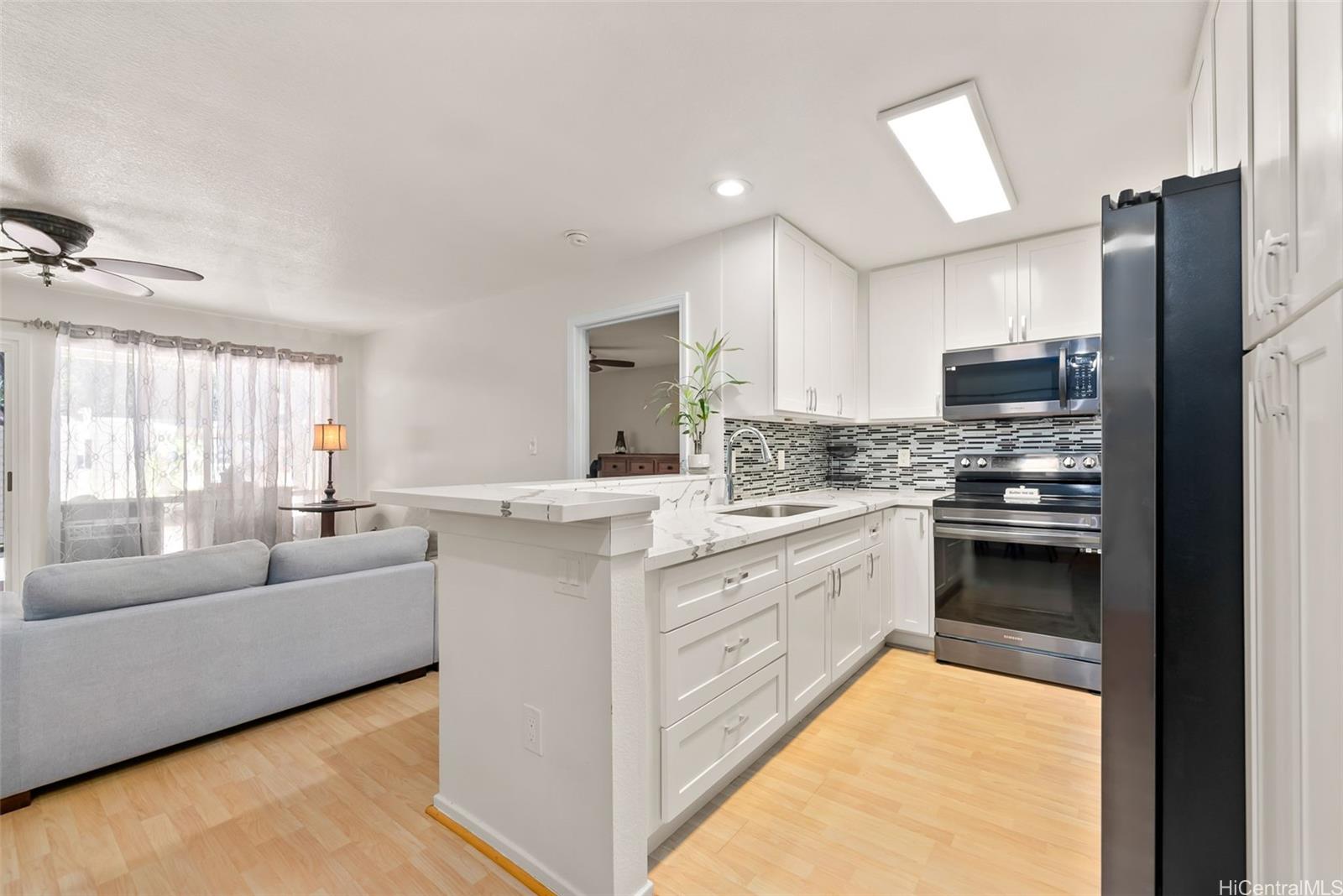 [0] => Discover privacy and modern comfort in this renovated corner end-unit in Launani Valley. Surrounded by lush hillside views and accessed by a private back stairway, this home has been thoughtfully upgraded throughout. The kitchen features white shaker cabinetry, marble-style quartz counters, a glass tile backsplash, sleek black stainless appliances, and a cozy breakfast nook with built-in seating and storage. Both bathrooms have been transformed with new vanities, modern lighting, and elegant tilework—including a stunning walk-in shower in the primary suite. The dual-suite layout offers spacious bedrooms on opposite sides of the home, each with direct access to the covered lanai and open yard space, ready for your imagination, gatherings, or indoor-outdoor living. Includes 1 covered and 1 open parking stall with storage. Enjoy community amenities including a pool, hot tub, playground, walking paths, and car wash.