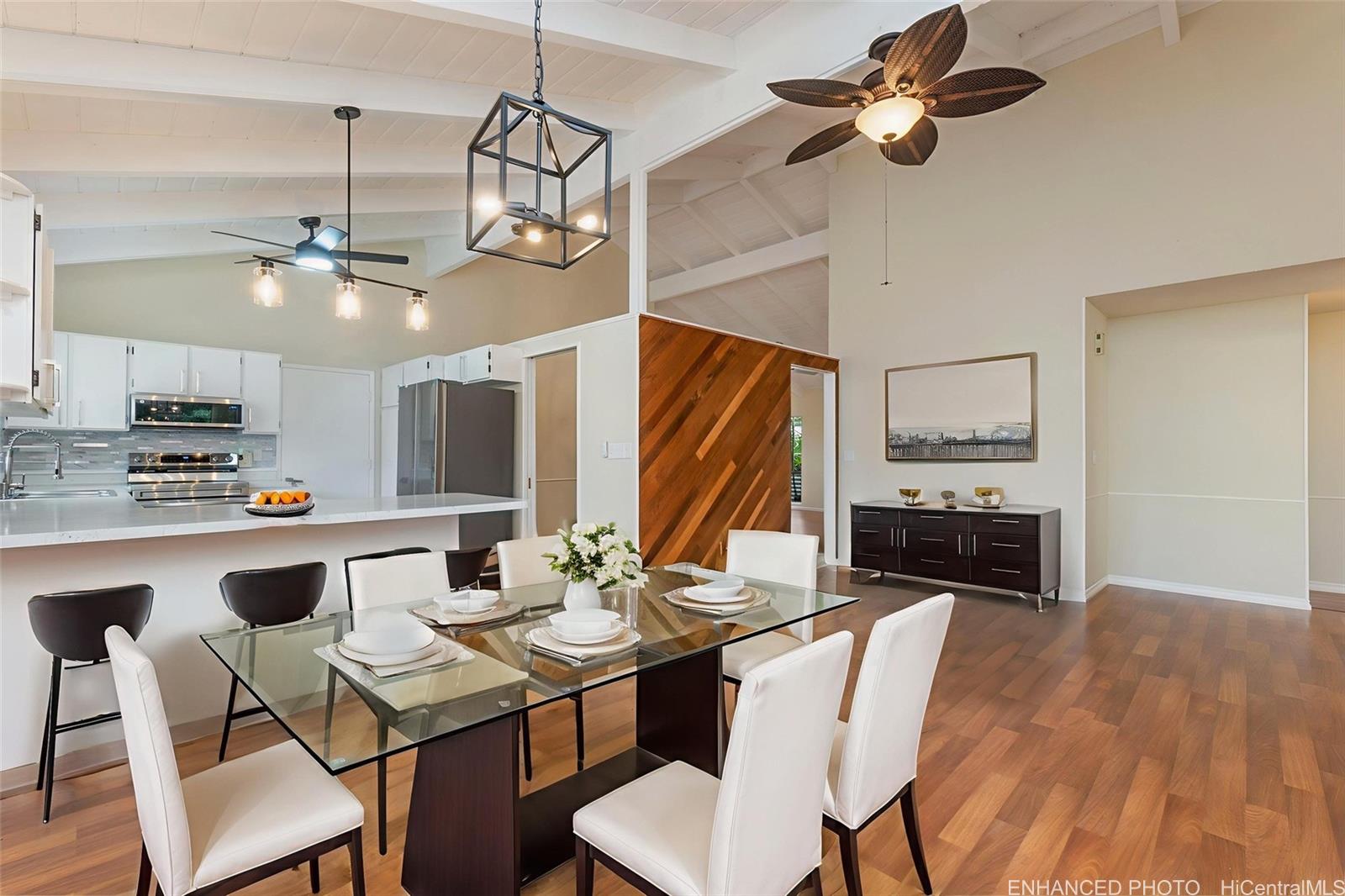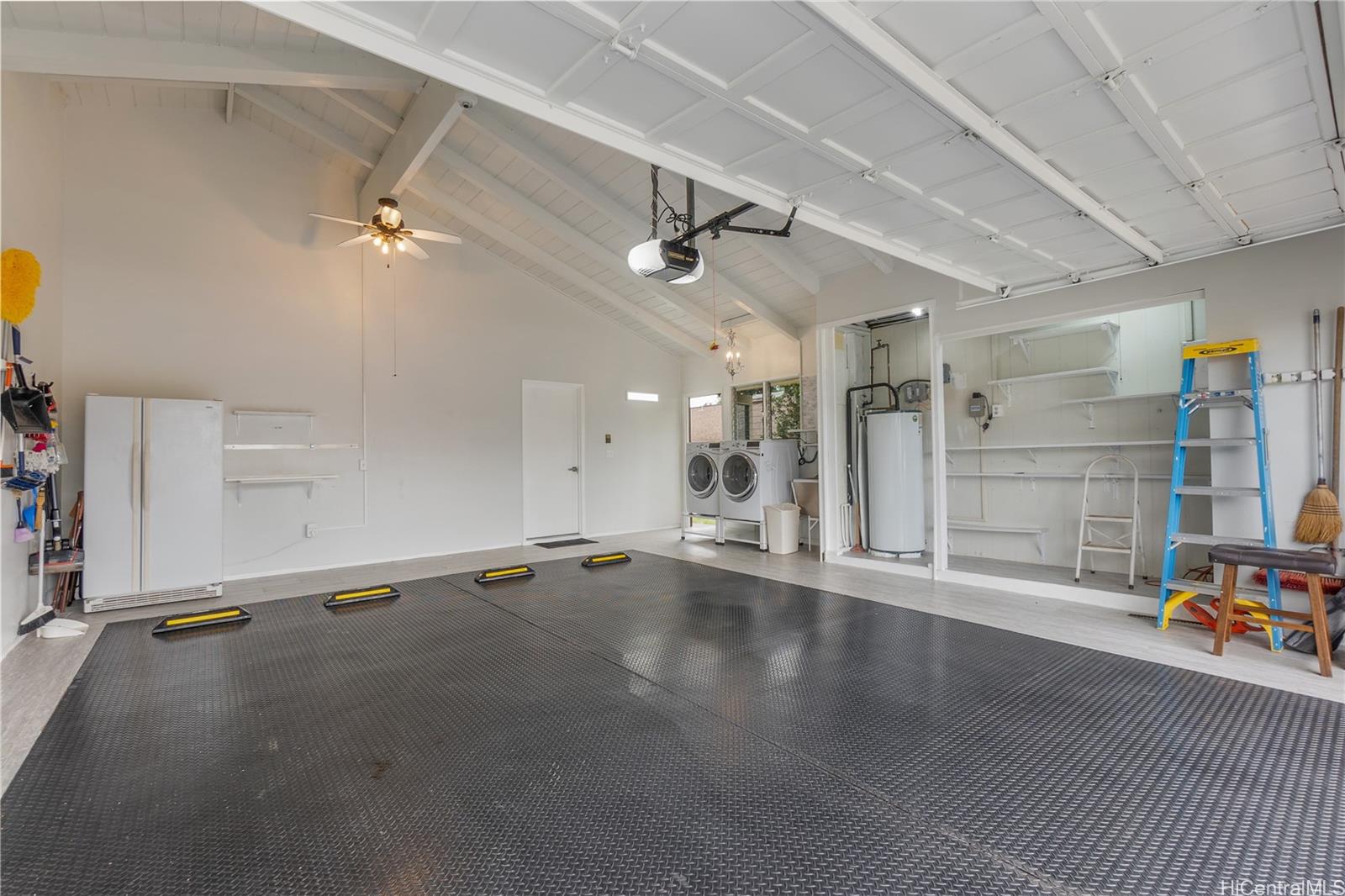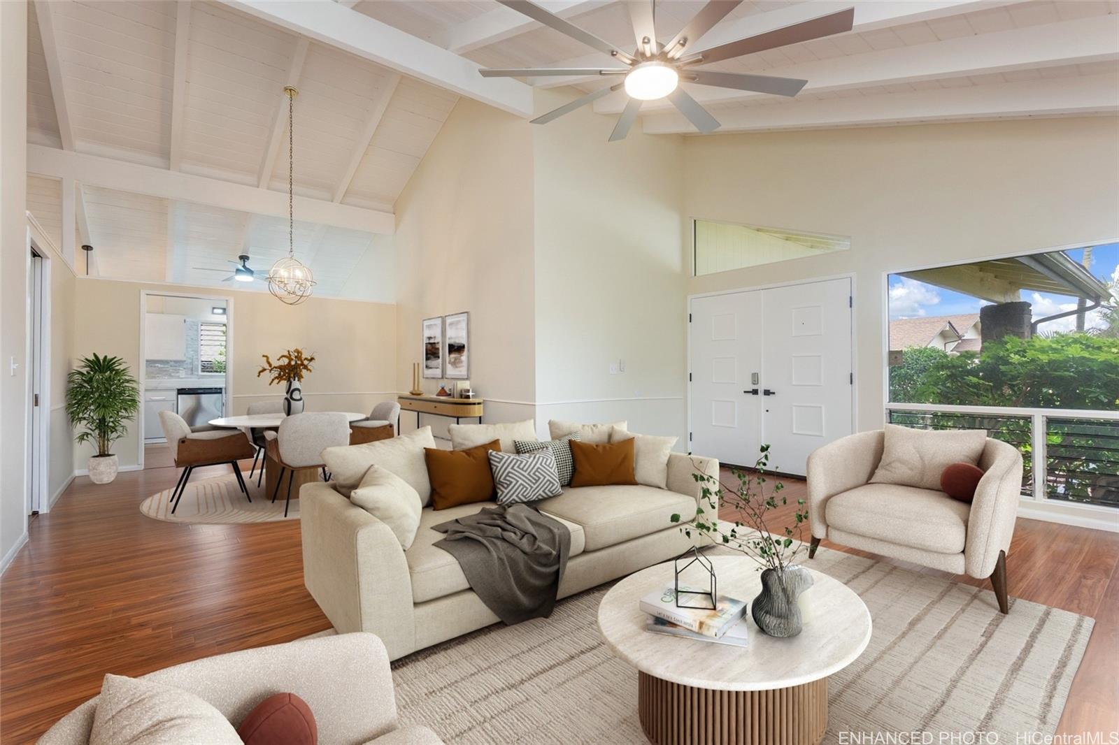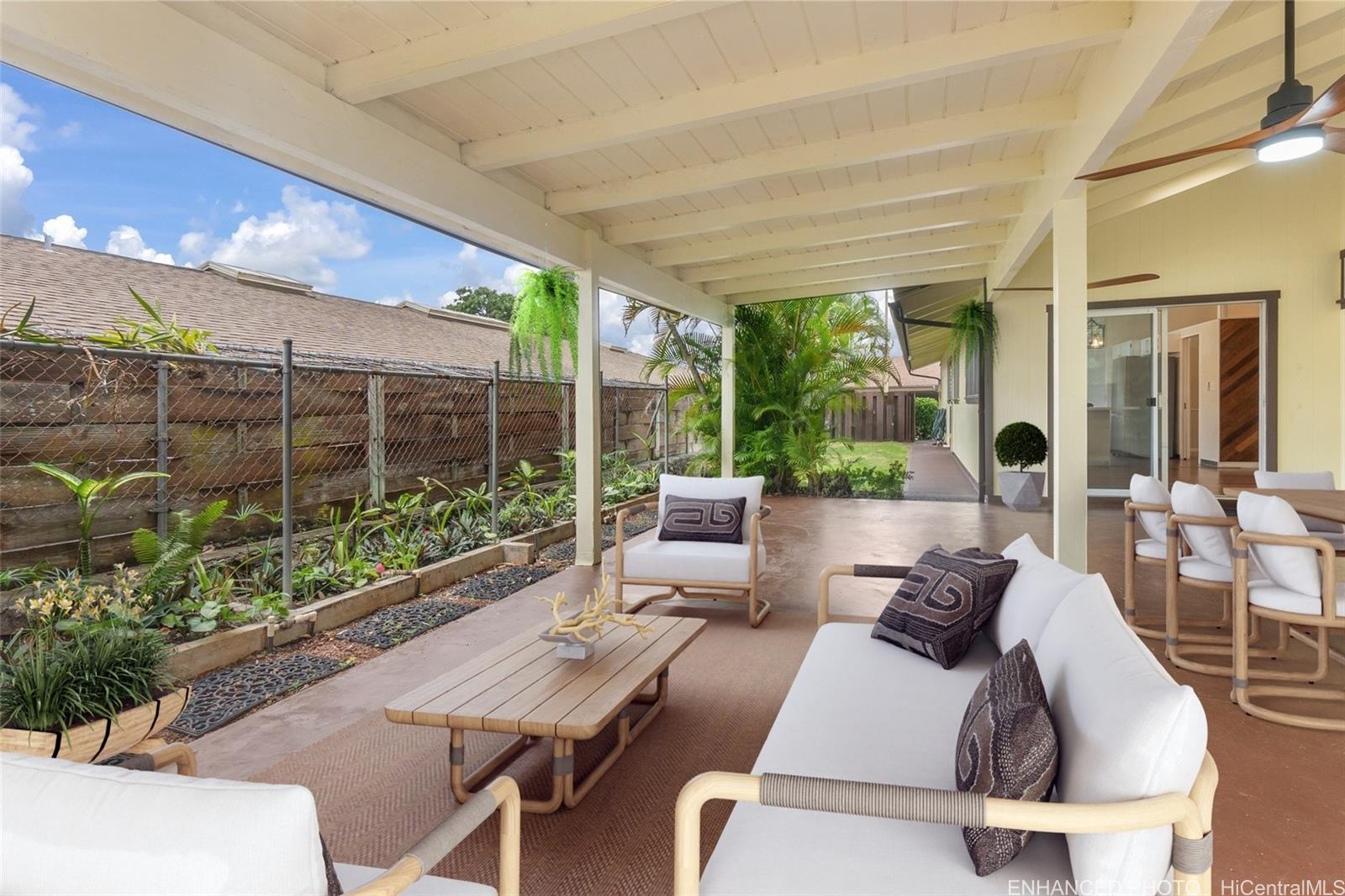 Outside, enjoy the privacy you rarely find: mostly flat, fully fenced backyard framed by trees and lush greenery. Entertain under the covered lanai and spread out on the expansive patio, new lighting w/ceiling fans—perfect for BBQs, pets, relaxed Hawai?i living. Oversized luxury 2-car garage with fabulous laundry, storage, and workspaces. Large driveway w/extra parking. Community Center membership included as part of the HOA is $55/month includes pool, jacuzzi, pickleball/tennis/basketball courts, + rentable gathering space. Easy access to Pearl Harbor, Pearlridge, transit, and planned new stadium. See it in person—this one is special! One or more photos have been enhanced."