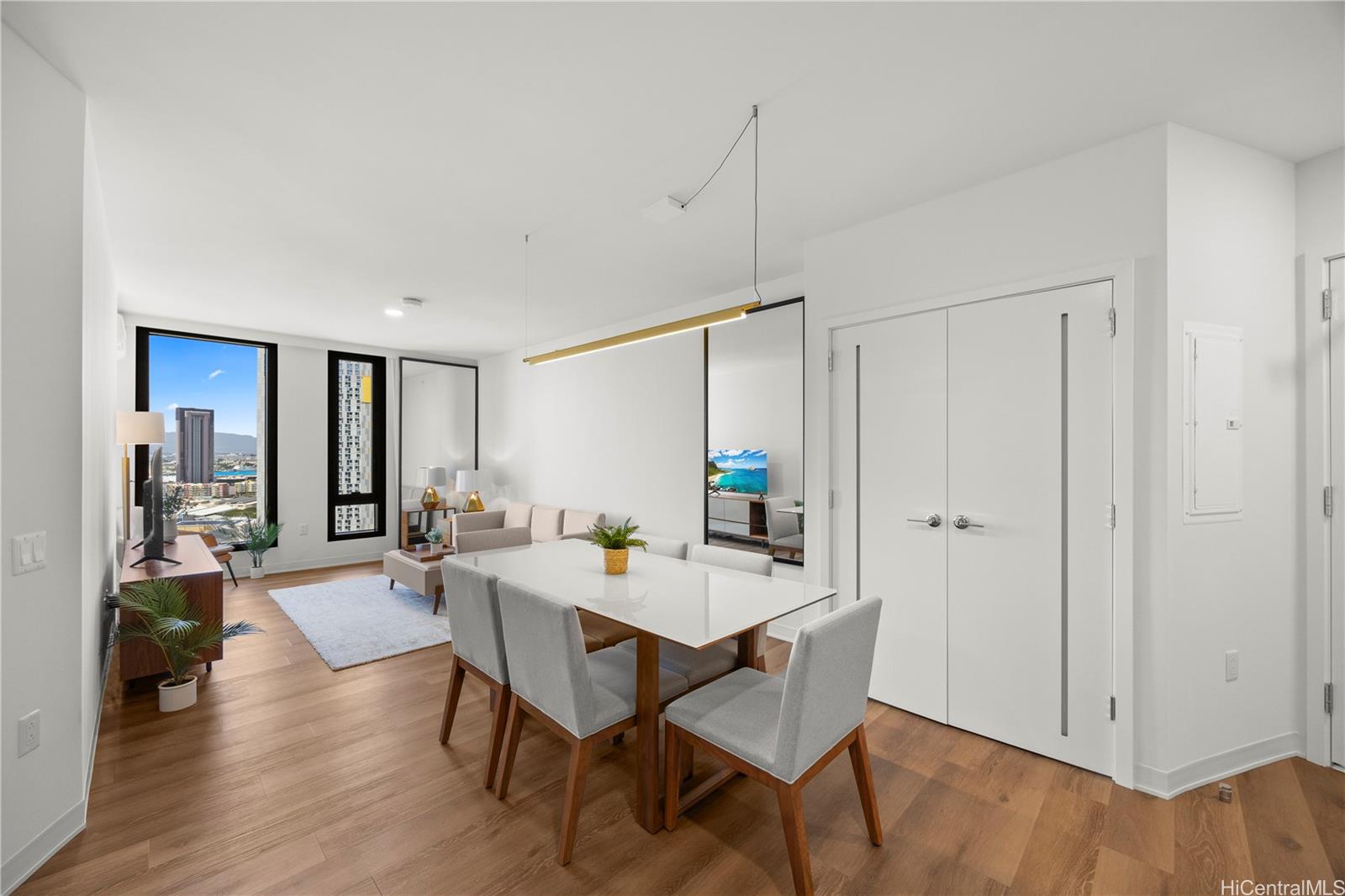 Spacious and large 1-bedroom in the heart of Ward Village. Park and ocean views. Good layout with privacy and natural light. Designed for both everyday living and entertaining. Fully furnished with modern finishes and a kitchen with with cabinetry, built-in appliances, and quartz countertops. Storage locker located directly above the parking stall for your convenience. Close to parks, shops, cafes, galleries, and transit. Enjoy premium amenities such as a gym, rooftop terrace, 24-hour concierge, and more. Listing by: ILC & Swell Realty LLC (808) 722-0583