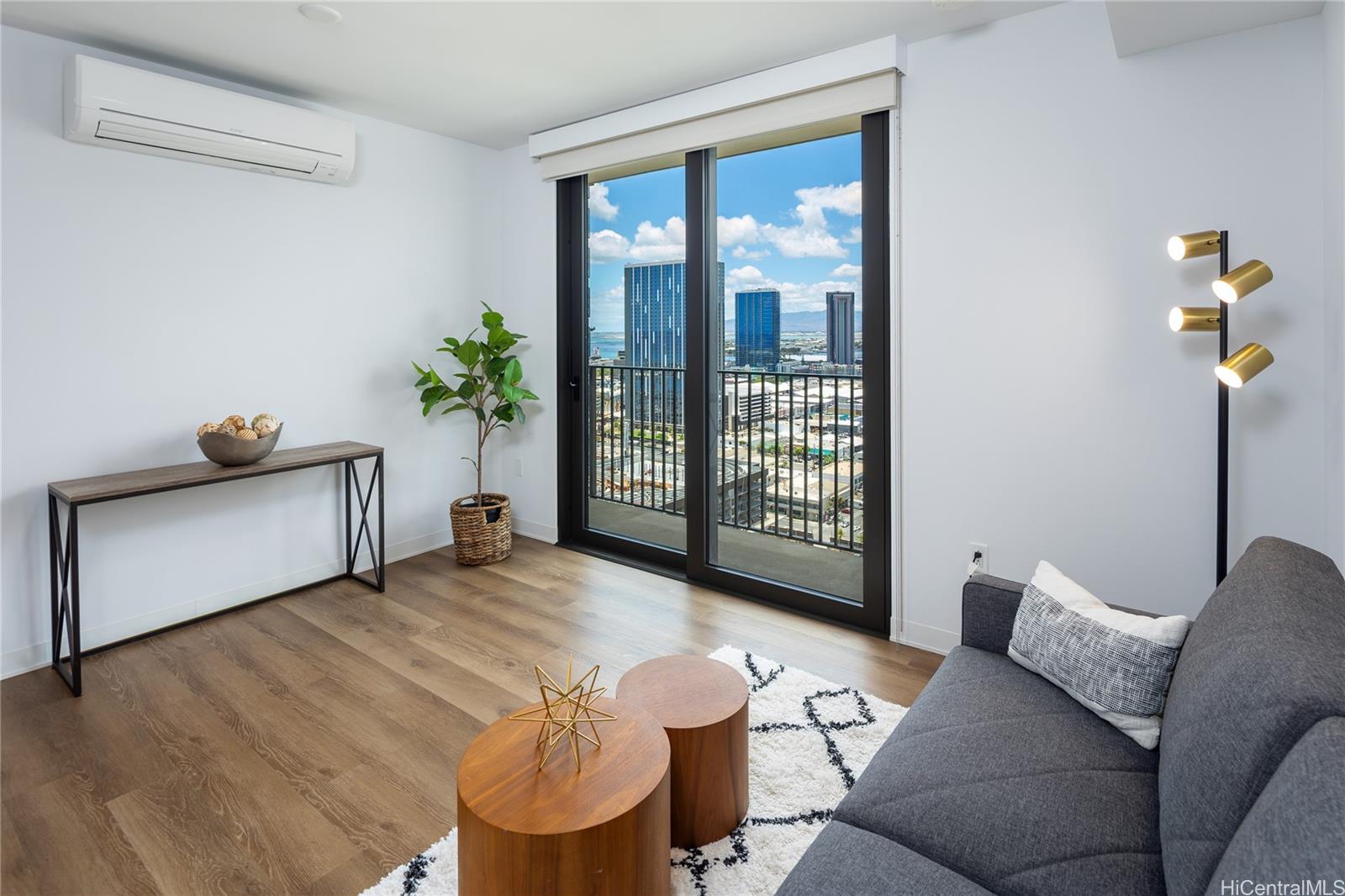 [0] => Welcome to 'A'ali'i in the heart of Ward Village. This one bedroom, one bath unit is located on the 24th floor with sweeping ocean, city and mountain views. Floor-to-ceiling glass sliding lanai door allows for natural light and refreshing trade winds to flow into the unit. The modern kitchen boasts Bosch appliances, sleek Studio Becker cabinetry, and quartz countertops. The unit comes equipped with a Mitsubishi split air condition unit, front-loading washer and dryer, and manual roller shades. 'A'ali'i amenities include a luxurious lobby, penthouse-level sky deck with panoramic ocean views, rooftop fitness club, indoor/outdoor event spaces, yoga room, BBQ areas and a resort-style pool and spa. The building also has ample guest parking, bicycle and surfboard storage facilities, and a dog park. Enjoy Kakaako living with great restaurants, amazing shopping, Whold Foods Market, Ward Theater Complex, and Ala Moana Beach Park just steps away.
