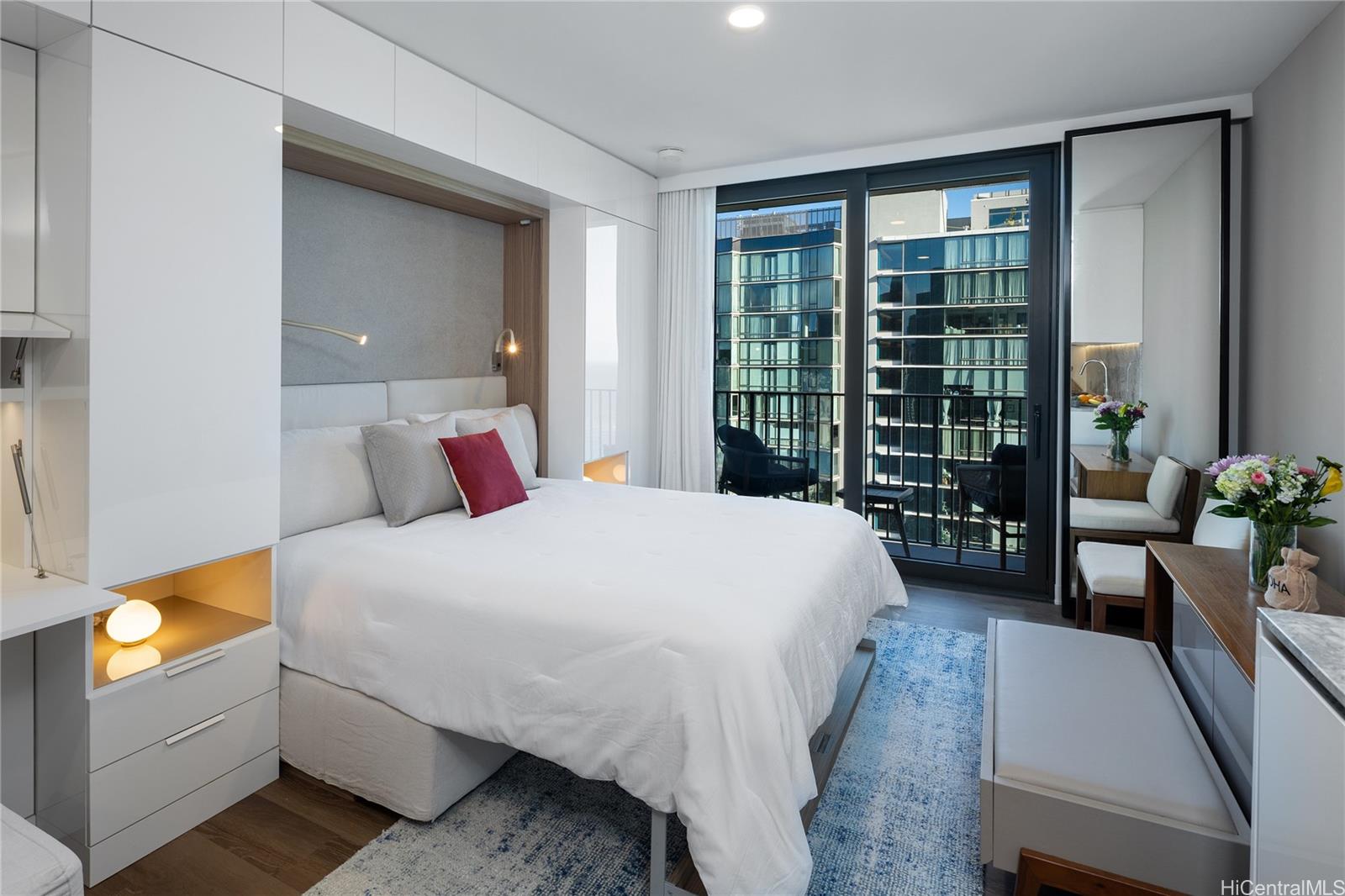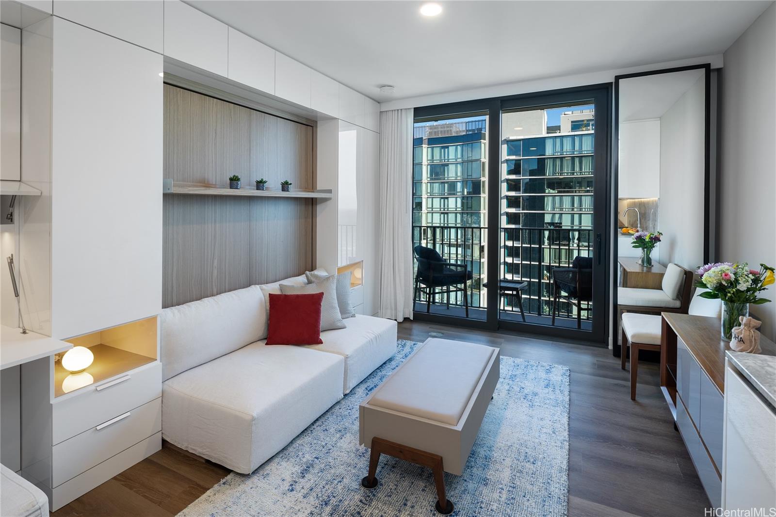 Experience elevated island living in this high-floor, turn-key studio at ‘A‘ali‘i, custom furnished by Rottet Studio. Designed for efficiency and style, this move-in-ready unit features smart modular wall furniture that maximizes space for a seamless living experience. The fully equipped kitchen includes tableware and accessories, making your transition effortless. Enjoy the convenience of an assigned parking stall with an electric charger and a bathroom outfitted with an electric outlet for a washlet. As a resident, you’ll have access to world-class amenities, including the penthouse-level fitness club, Lanai 42, and a sky lounge with breathtaking ocean views. The 8th-floor amenity deck offers resort-style features such as cabanas, private indoor/outdoor dining areas, BBQ stations, a pool, a jacuzzi, a children’s pool, and a playground. Located in the vibrant heart of Ward Village, you’ll be close to top restaurants, spas, coffee shops, a dog park, and Ala Moana Beach. Don’t miss this opportunity to own a thoughtfully designed home in one of Honolulu’s most desirable communities! Listing by: Engel & Volkers Honolulu (808) 232-6420