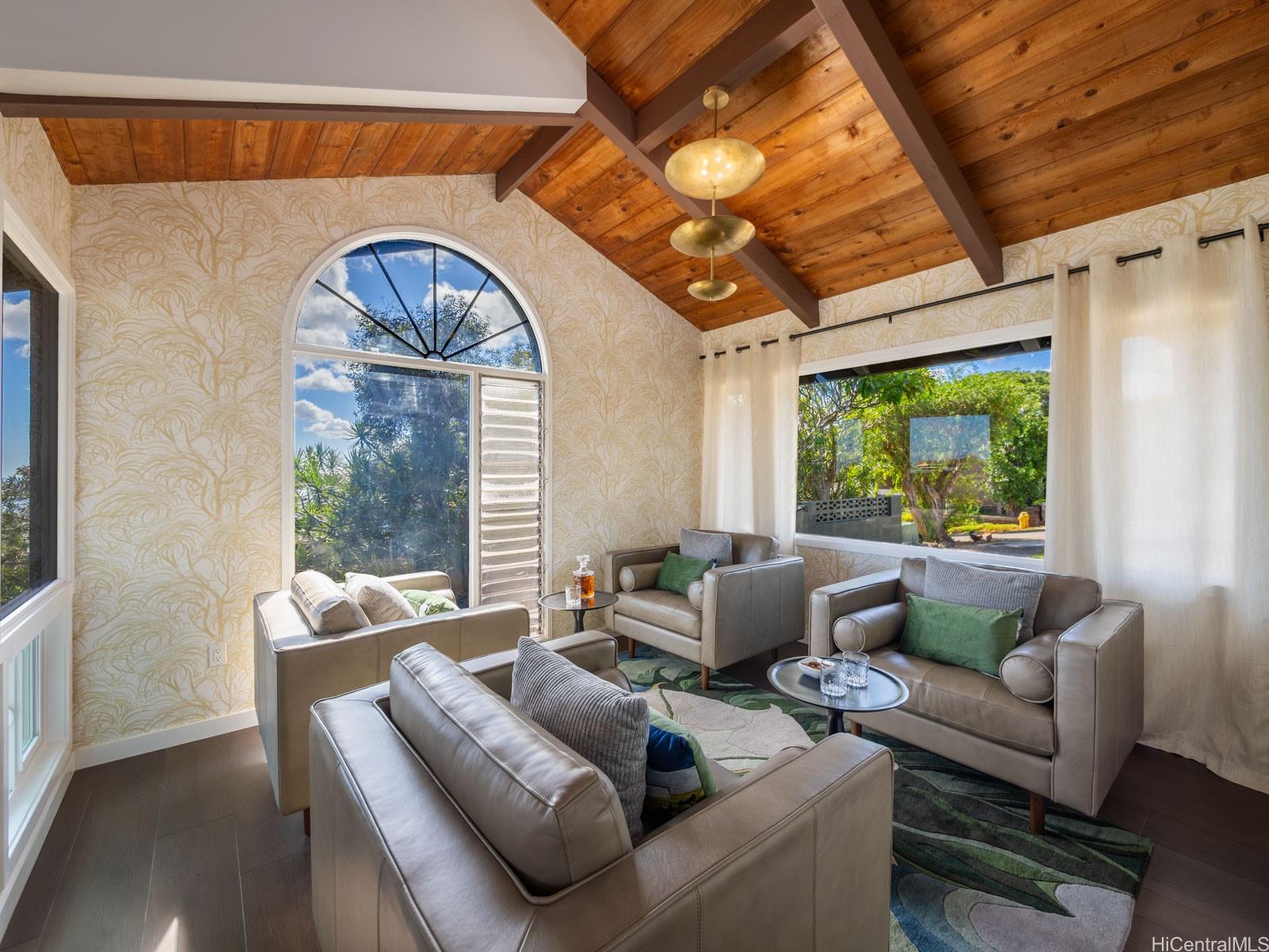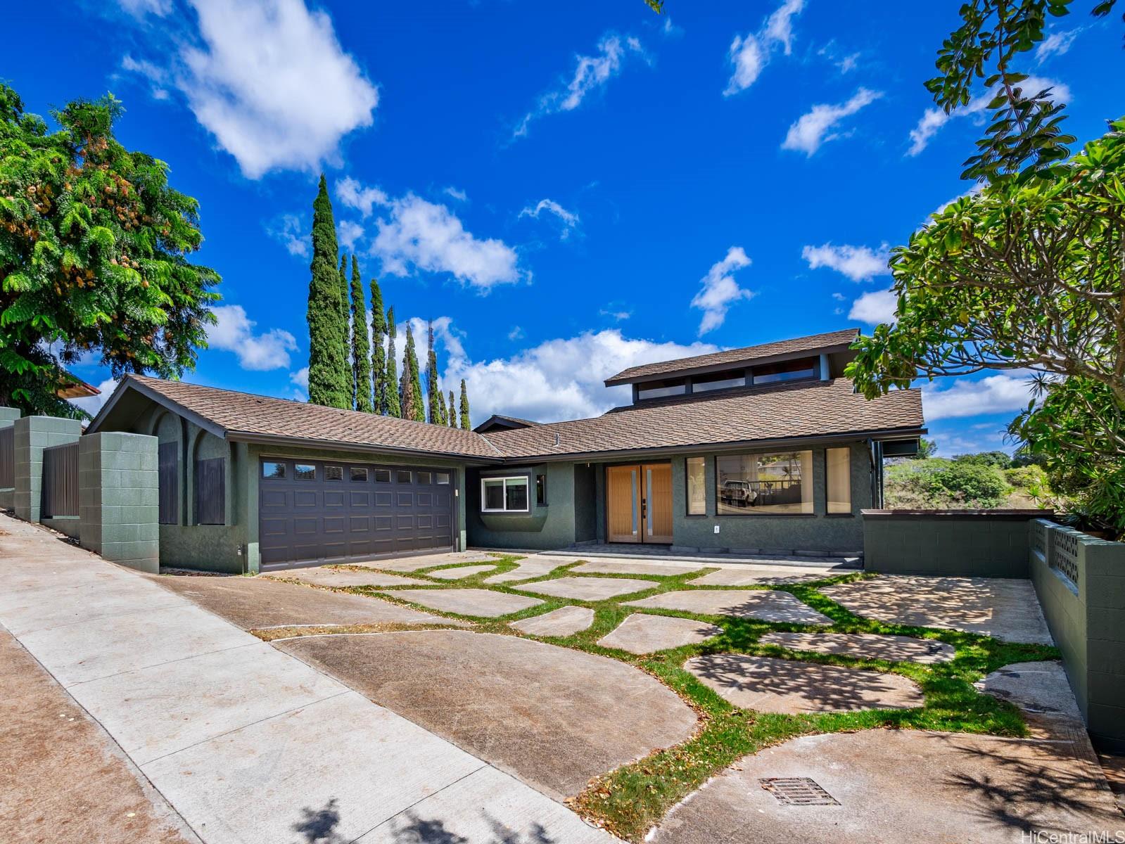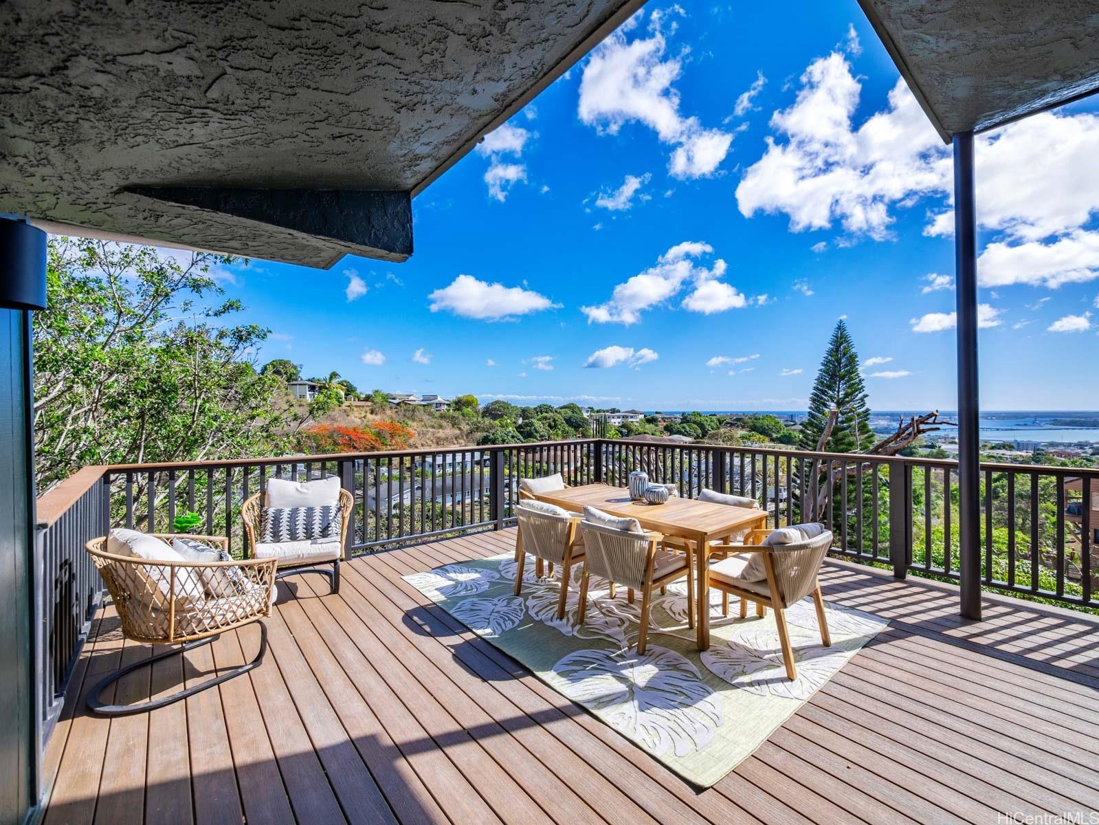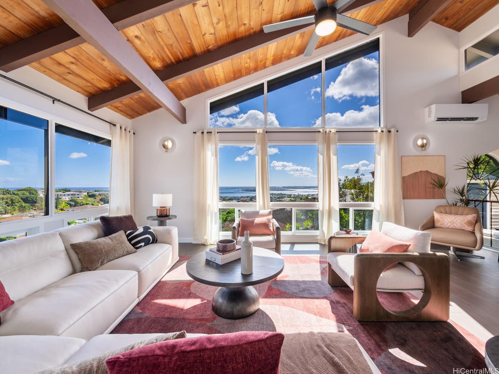 Welcome to this unparalleled residence that rivals the most prestigious neighborhoods and redefines luxury living in Aiea Heights. This exceptional home has been fully + meticulously renovated and boasts expansive ocean views, 5 spacious bedrooms, 3.5 bathrooms and sits on an oversized 20,711 sf lot. With beautiful high ceilings and steel-frame construction, this home offers unique mid-century modern architecture that flows seamlessly throughout the indoor and outdoor spaces. The primary bedroom suite on the main floor is a haven of tranquility, complete with a large, luxurious en suite bathroom that promises a spa-like experience every day. Designed for both relaxation and entertainment, this home features a wrap-around deck, sophisticated cigar + whiskey lounge, an indoor sauna, and a rumpus room with a wet bar—perfect for hosting guests or unwinding in style. Located on a highly desirable street with underground utilities and great curb appeal. Listing by: Compass (808) 825-4277