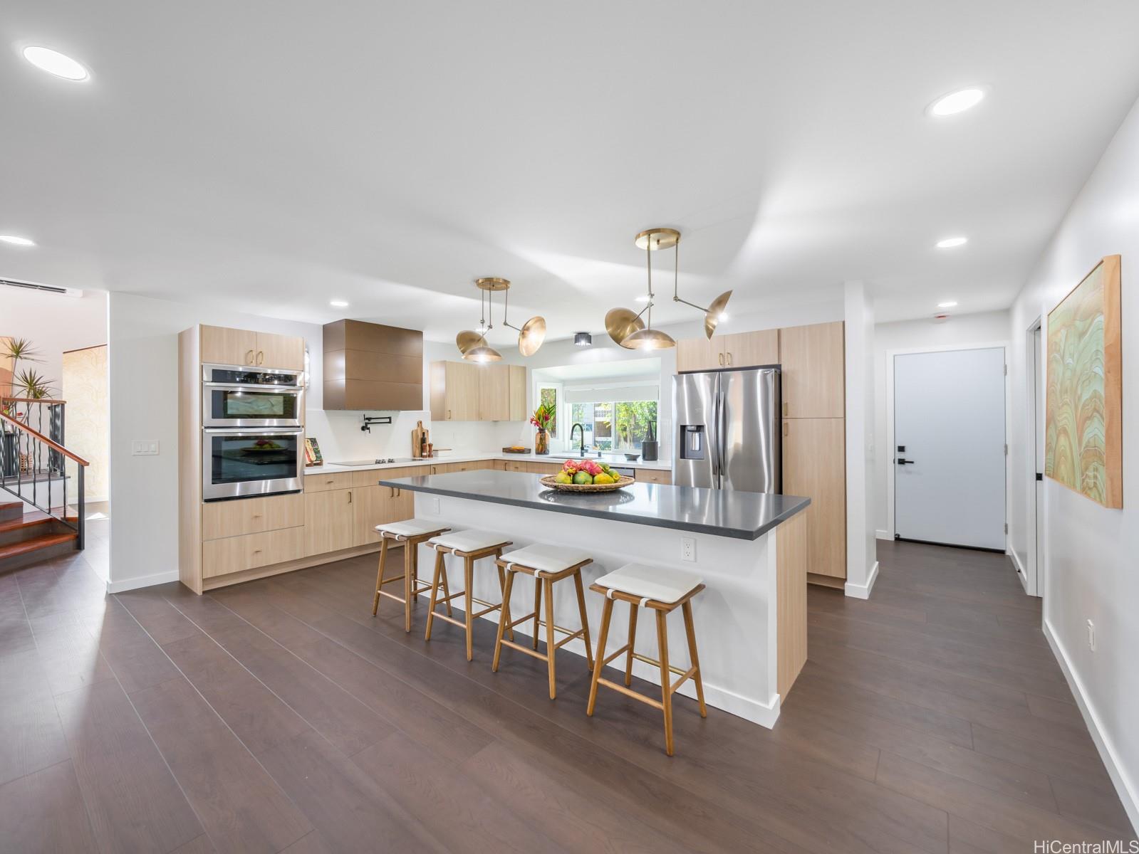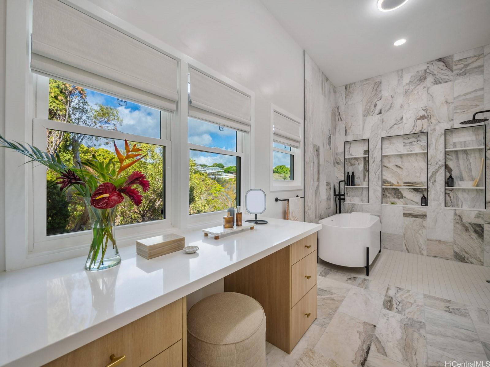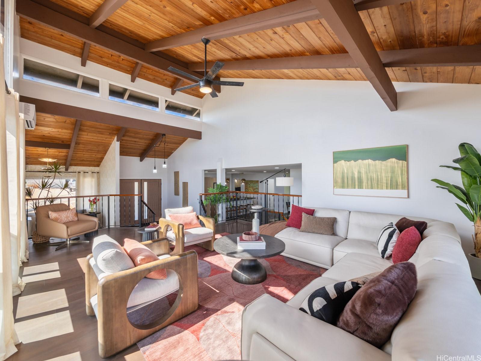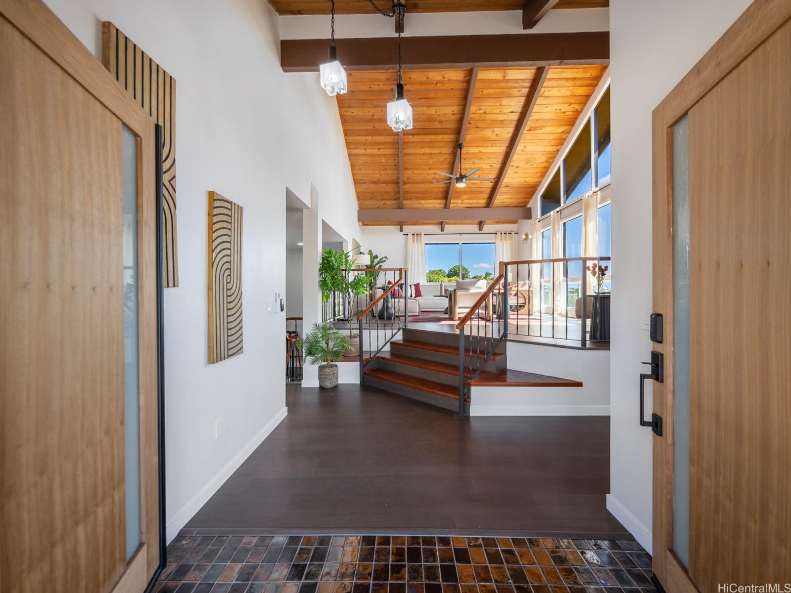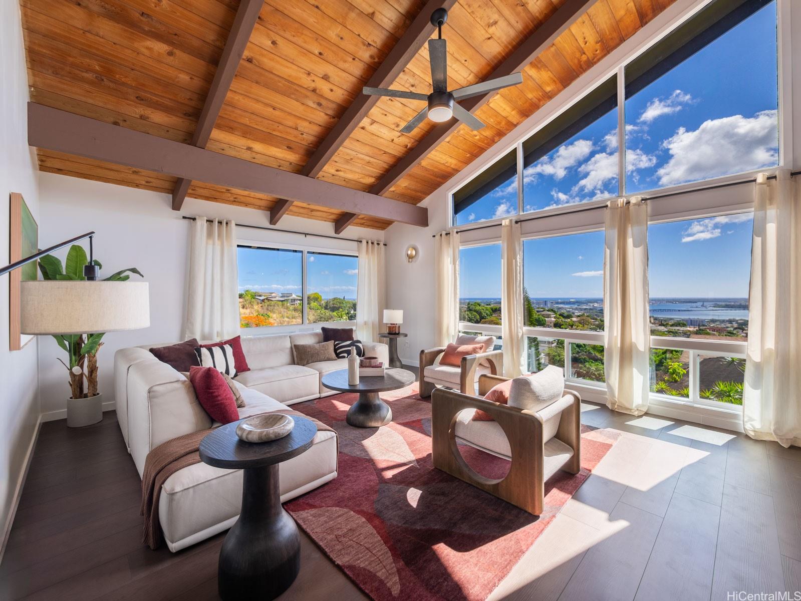 Welcome to this unparalleled residence that rivals the most prestigious neighborhoods and redefines luxury living in Aiea Heights. This exceptional home has been fully + meticulously renovated and boasts expansive ocean views, 5 spacious bedrooms, 3.5 bathrooms and sits on an oversized 20,711 sf lot. With beautiful high ceilings and steel-frame construction, this home offers unique mid-century modern architecture that flows seamlessly throughout the indoor and outdoor spaces. The primary bedroom suite on the main floor is a haven of tranquility, complete with a large, luxurious en suite bathroom that promises a spa-like experience every day. Designed for both relaxation and entertainment, this home features a wrap-around deck, sophisticated cigar + whiskey lounge, an indoor sauna, and a rumpus room with a wet bar—perfect for hosting guests or unwinding in style. Located on a highly desirable street with underground utilities and great curb appeal. Listing by: Compass (808) 825-4277