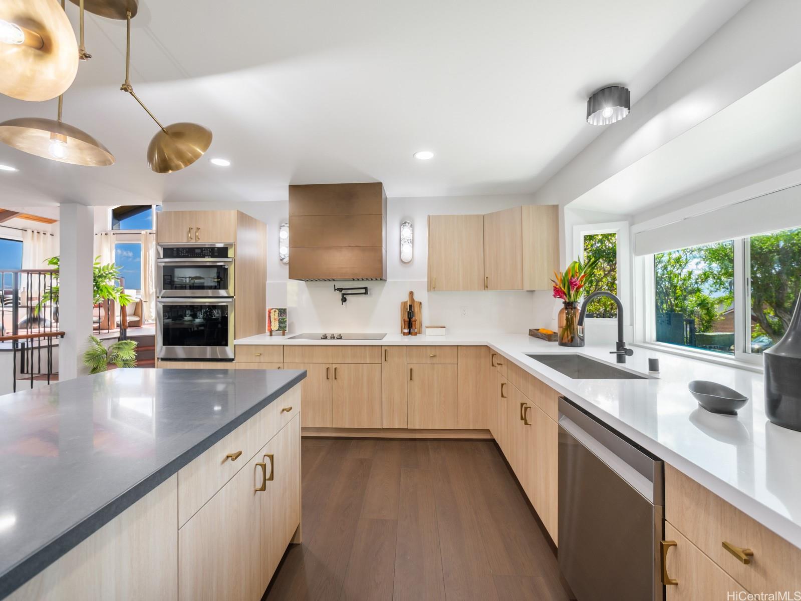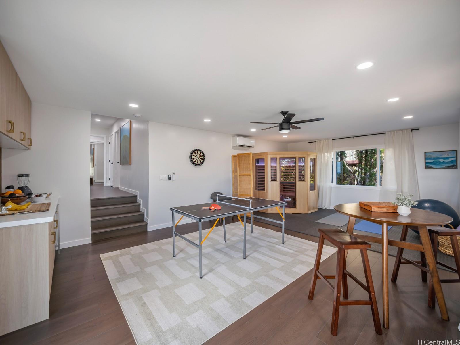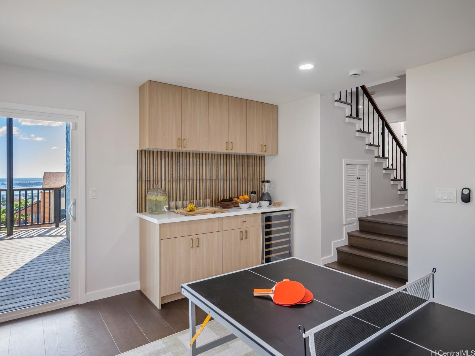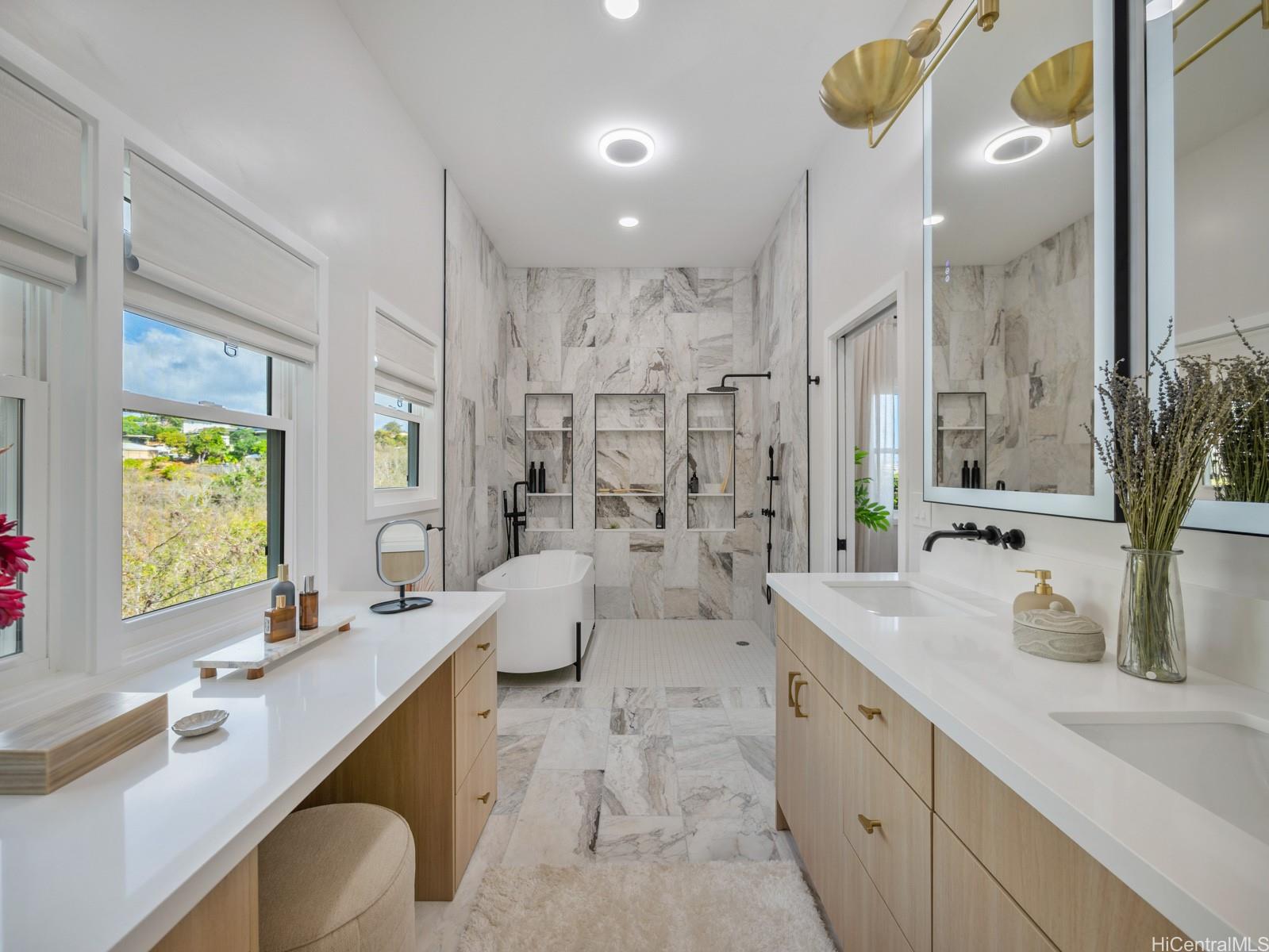 Welcome to this unparalleled residence that rivals the most prestigious neighborhoods and redefines luxury living in Aiea Heights. This exceptional home has been fully + meticulously renovated and boasts expansive ocean views, 5 spacious bedrooms, 3.5 bathrooms and sits on an oversized 20,711 sf lot. With beautiful high ceilings and steel-frame construction, this home offers unique mid-century modern architecture that flows seamlessly throughout the indoor and outdoor spaces. The primary bedroom suite on the main floor is a haven of tranquility, complete with a large, luxurious en suite bathroom that promises a spa-like experience every day. Designed for both relaxation and entertainment, this home features a wrap-around deck, sophisticated cigar + whiskey lounge, an indoor sauna, and a rumpus room with a wet bar—perfect for hosting guests or unwinding in style. Located on a highly desirable street with underground utilities and great curb appeal. Listing by: Compass (808) 825-4277