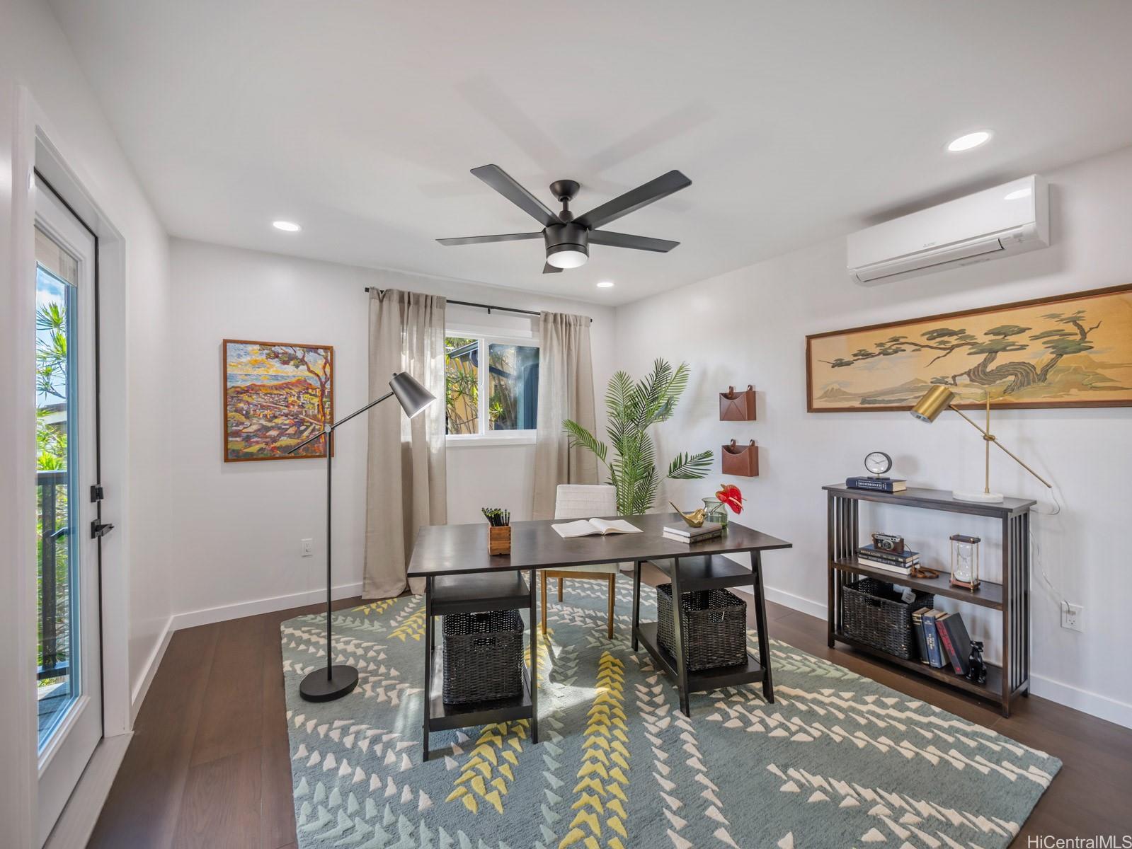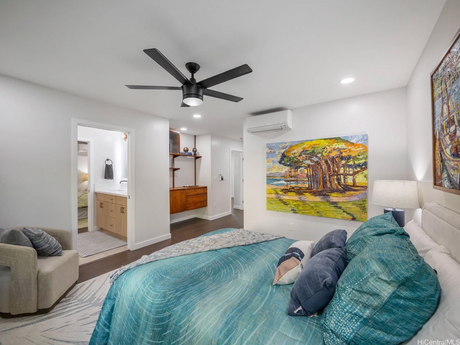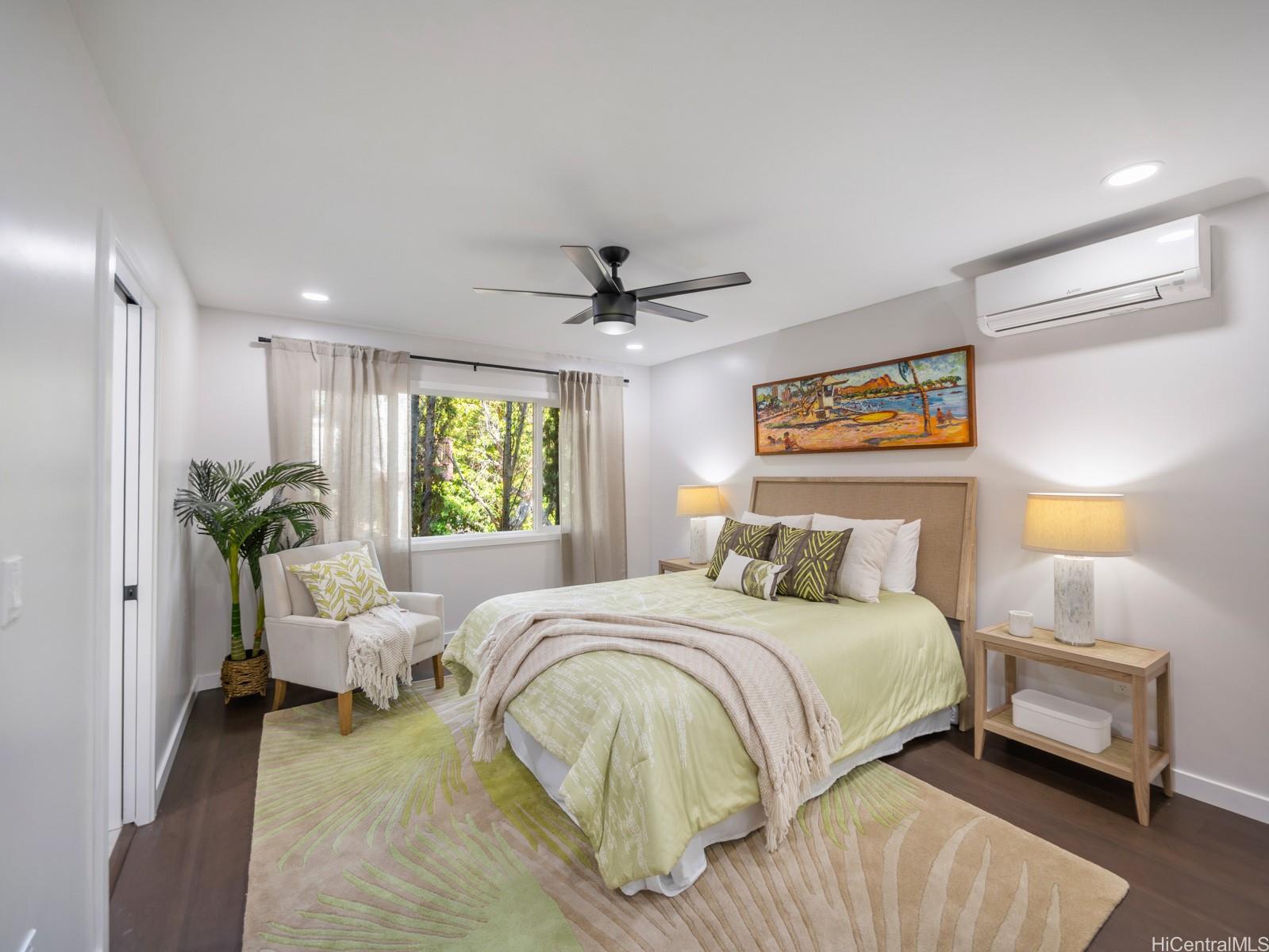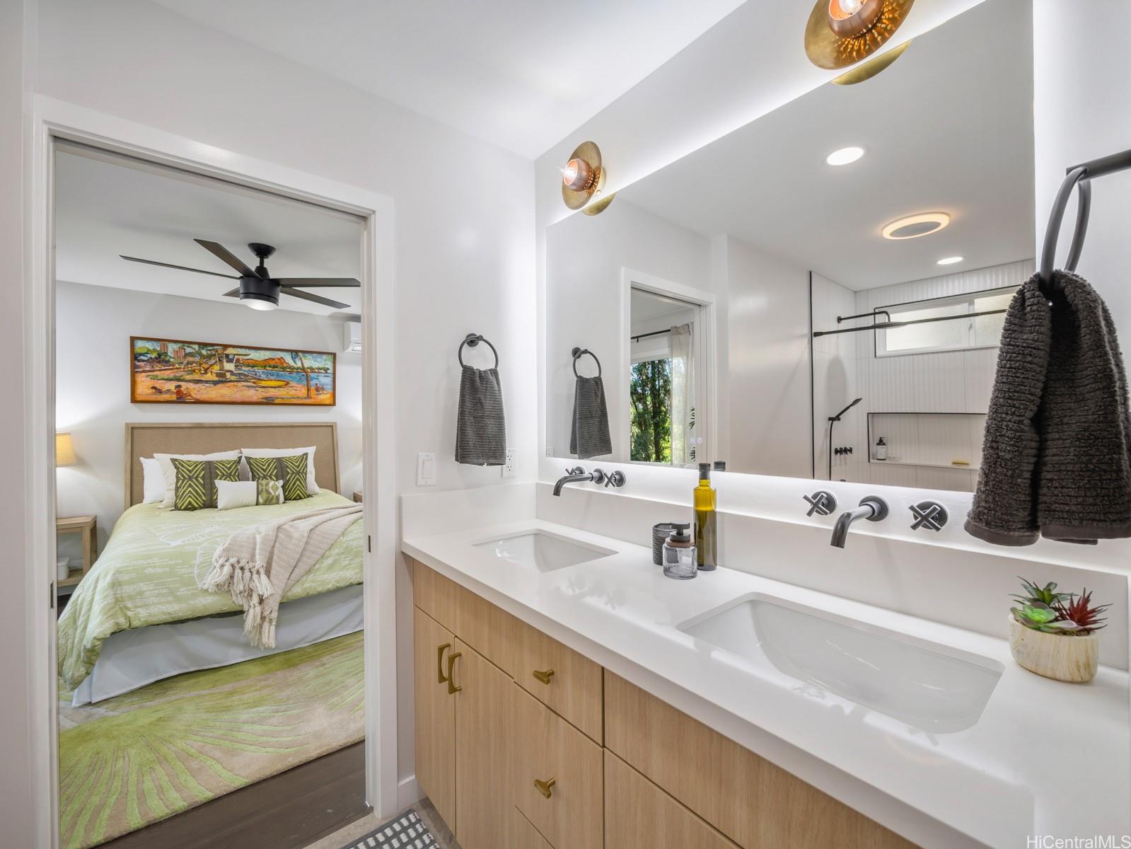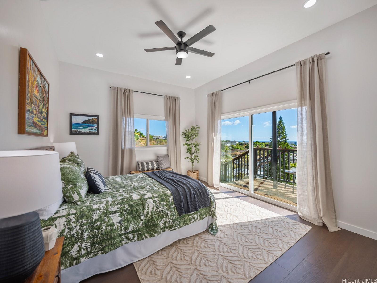 Welcome to this unparalleled residence that rivals the most prestigious neighborhoods and redefines luxury living in Aiea Heights. This exceptional home has been fully + meticulously renovated and boasts expansive ocean views, 5 spacious bedrooms, 3.5 bathrooms and sits on an oversized 20,711 sf lot. With beautiful high ceilings and steel-frame construction, this home offers unique mid-century modern architecture that flows seamlessly throughout the indoor and outdoor spaces. The primary bedroom suite on the main floor is a haven of tranquility, complete with a large, luxurious en suite bathroom that promises a spa-like experience every day. Designed for both relaxation and entertainment, this home features a wrap-around deck, sophisticated cigar + whiskey lounge, an indoor sauna, and a rumpus room with a wet bar—perfect for hosting guests or unwinding in style. Located on a highly desirable street with underground utilities and great curb appeal. Listing by: Compass (808) 825-4277