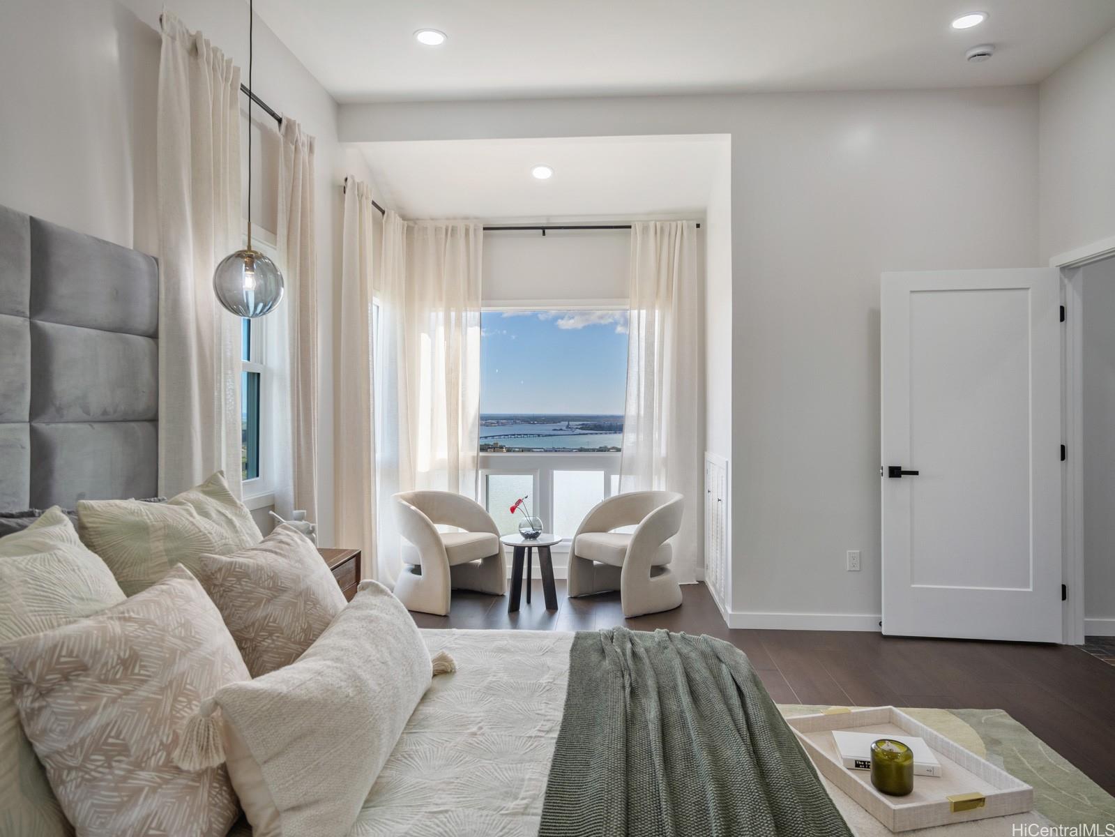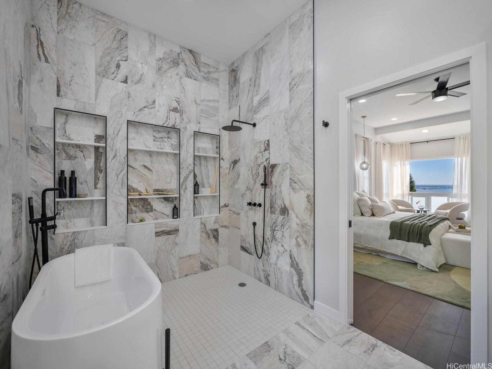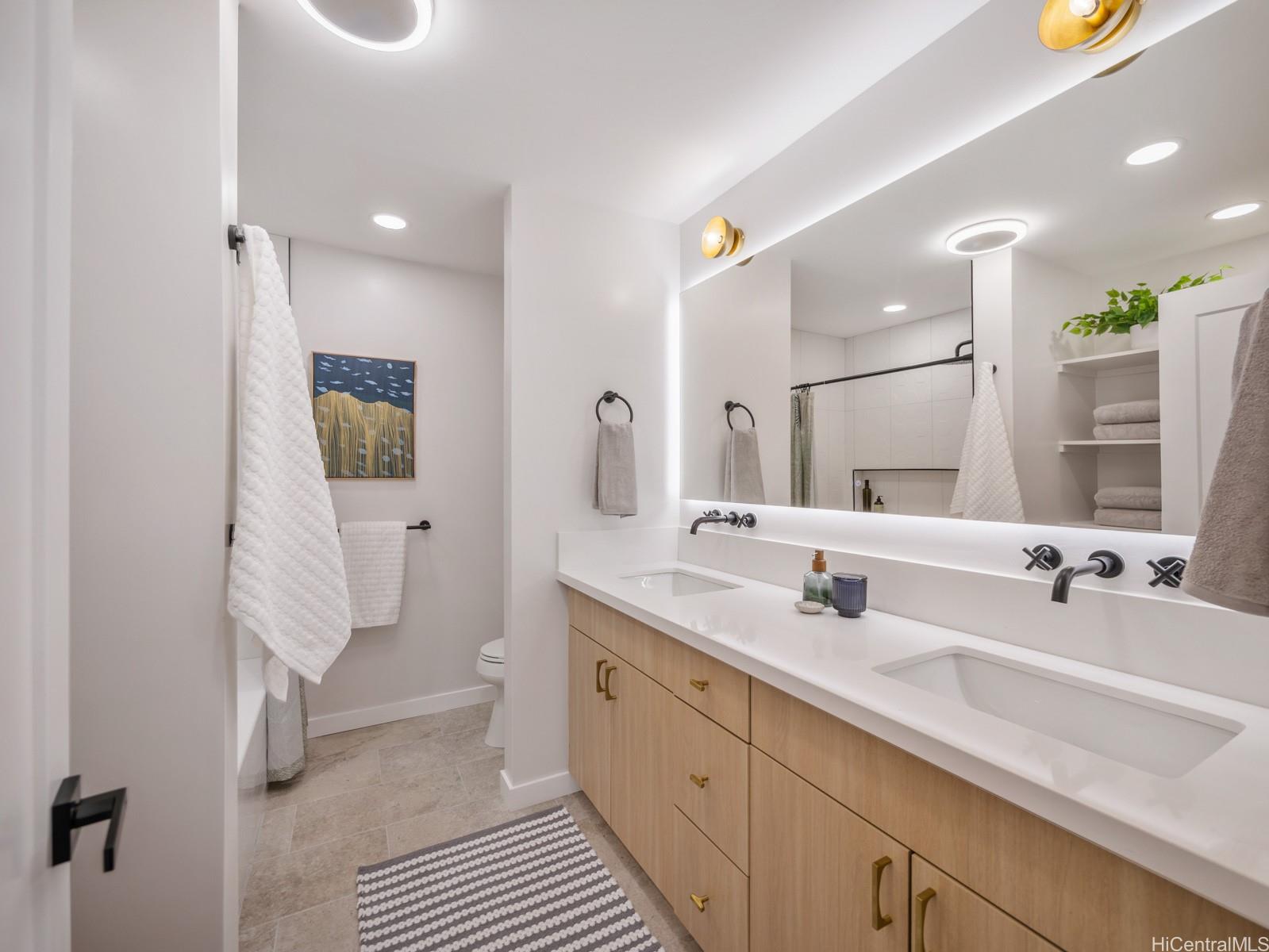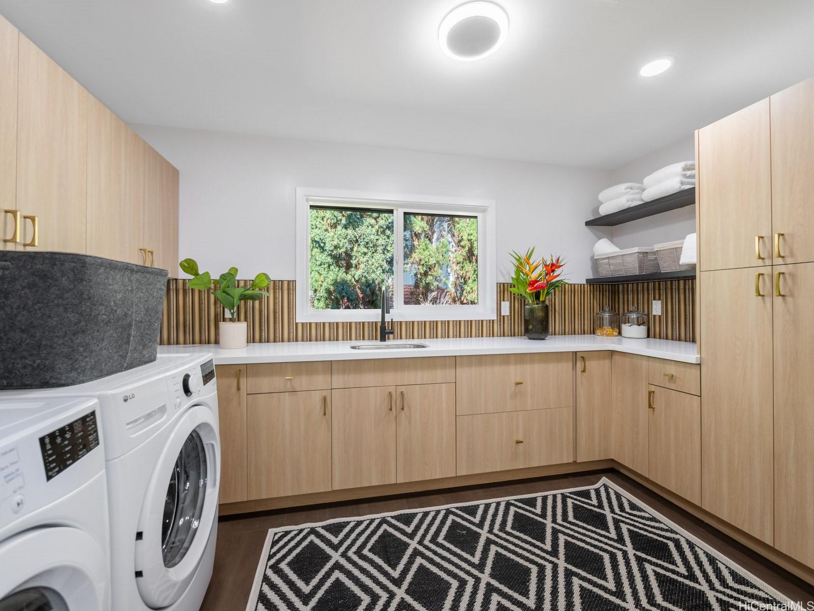 Welcome to this unparalleled residence that rivals the most prestigious neighborhoods and redefines luxury living in Aiea Heights. This exceptional home has been fully + meticulously renovated and boasts expansive ocean views, 5 spacious bedrooms, 3.5 bathrooms and sits on an oversized 20,711 sf lot. With beautiful high ceilings and steel-frame construction, this home offers unique mid-century modern architecture that flows seamlessly throughout the indoor and outdoor spaces. The primary bedroom suite on the main floor is a haven of tranquility, complete with a large, luxurious en suite bathroom that promises a spa-like experience every day. Designed for both relaxation and entertainment, this home features a wrap-around deck, sophisticated cigar + whiskey lounge, an indoor sauna, and a rumpus room with a wet bar—perfect for hosting guests or unwinding in style. Located on a highly desirable street with underground utilities and great curb appeal. Listing by: Compass (808) 825-4277