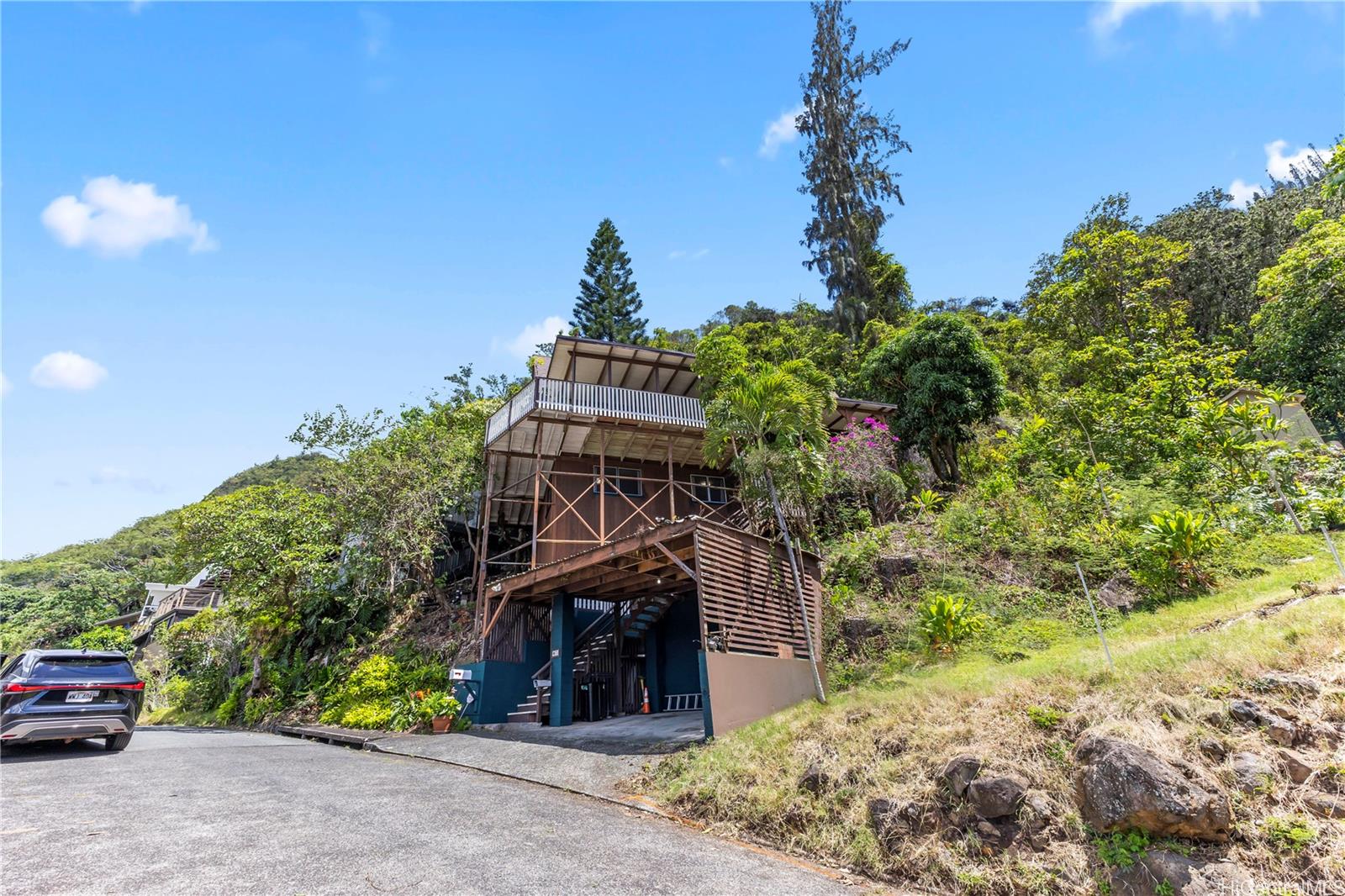 [0] => Step into this architecturally distinctive A-frame retreat in the lush Manoa Valley—where mid-century modern charm meets breathtaking natural beauty. Crafted for style and functionality, this home captures panoramic valley, mountain, and ocean views from multiple vantage points. Its clean lines, vaulted ceilings, and expansive windows reflect architect Carl Reinhardt’s signature mid-century style, while the flexible layout offers exceptional versatility for multi-generational living or creative use of space.